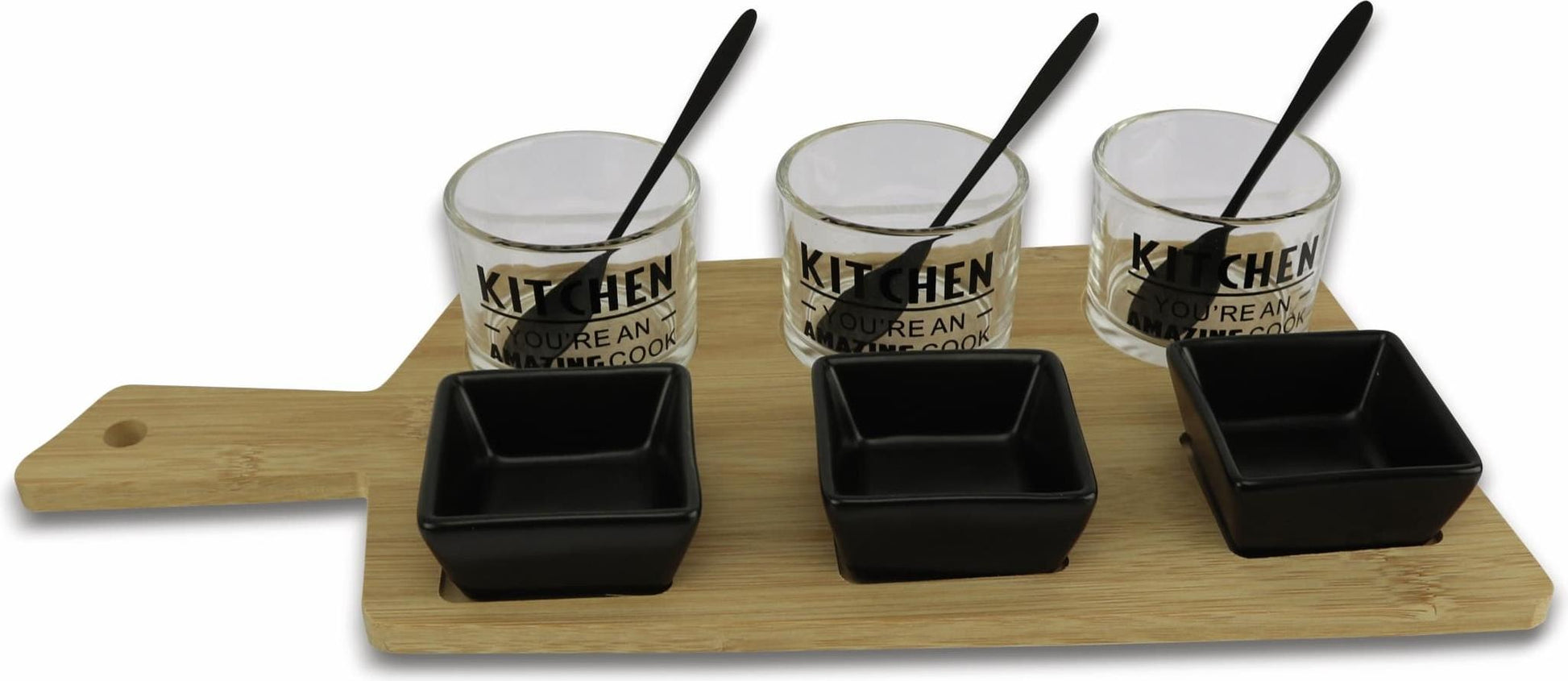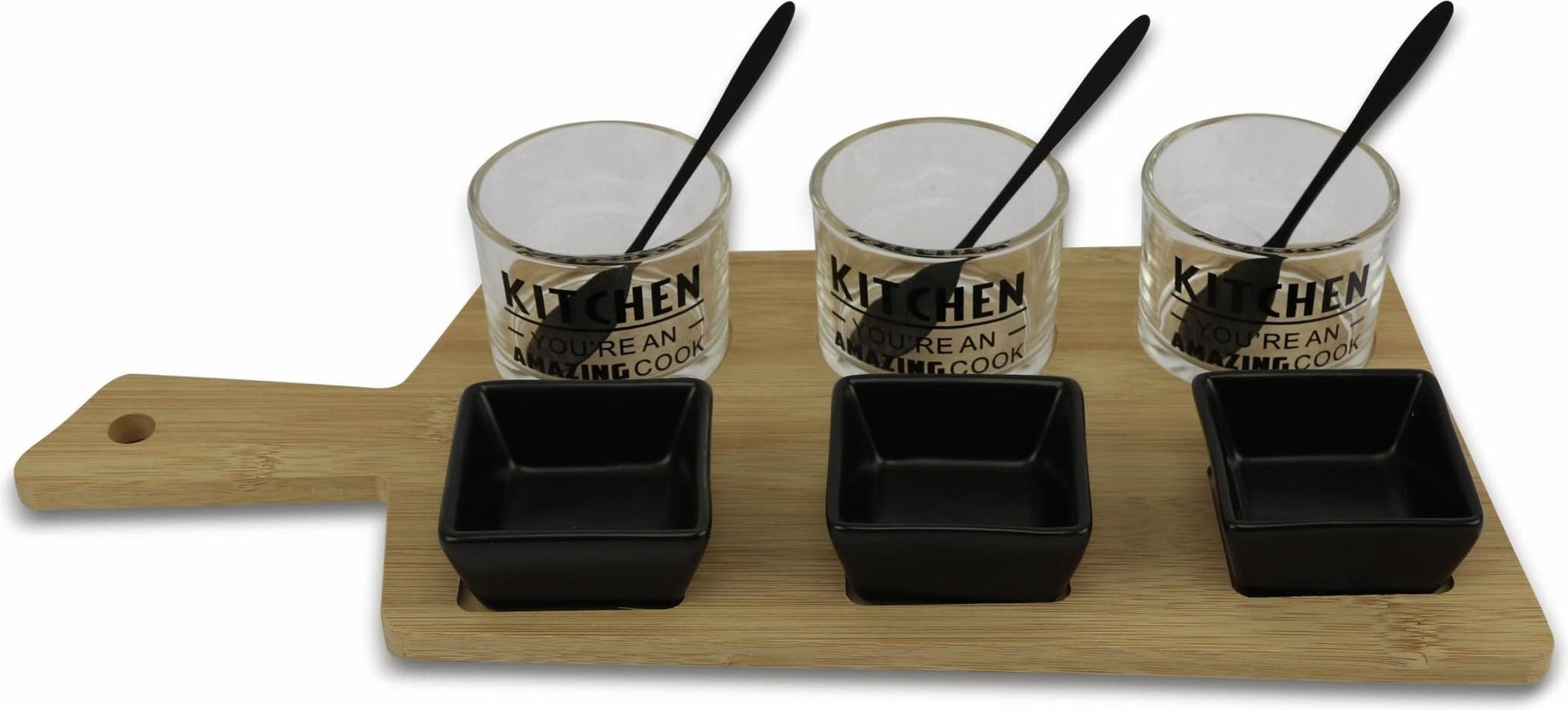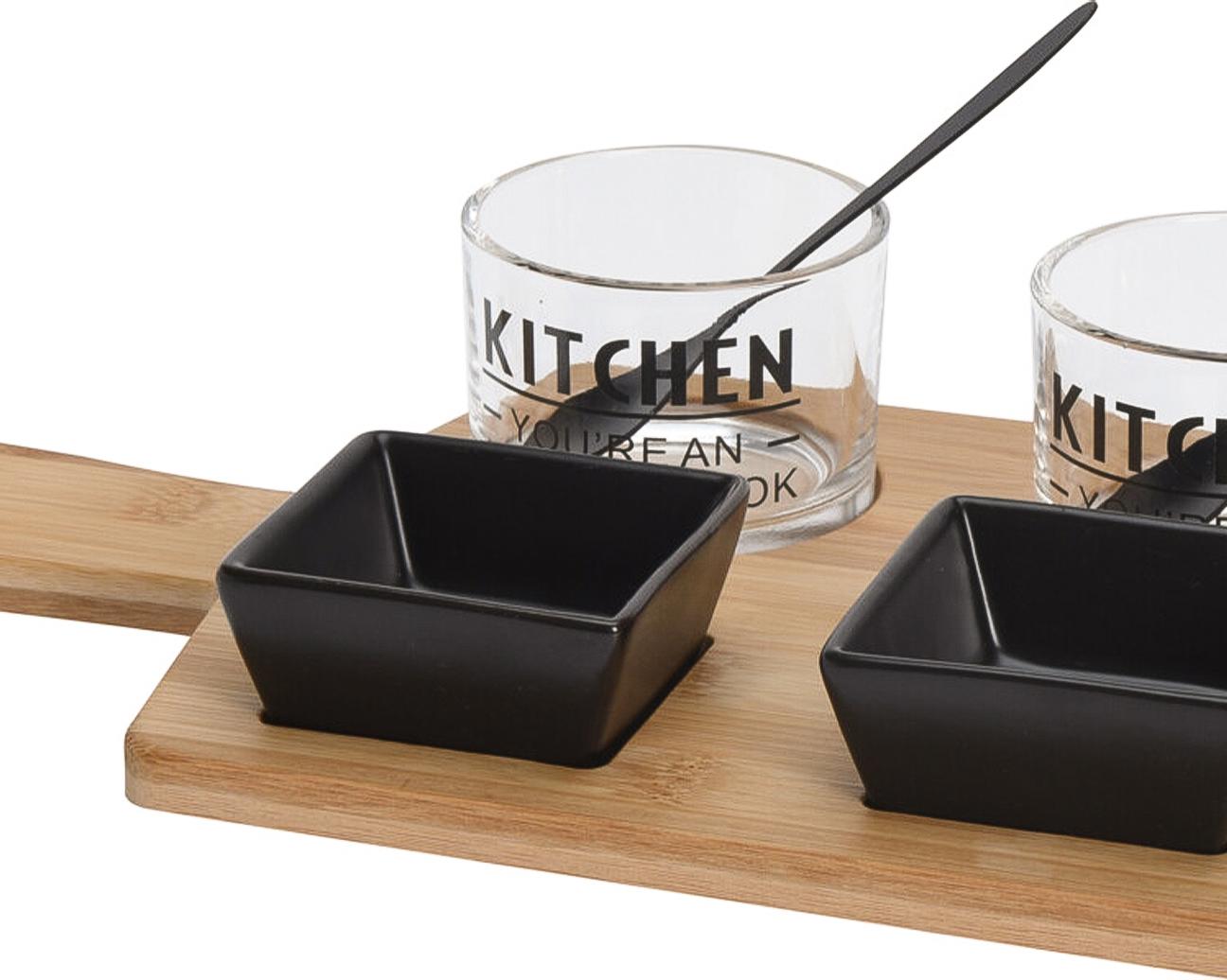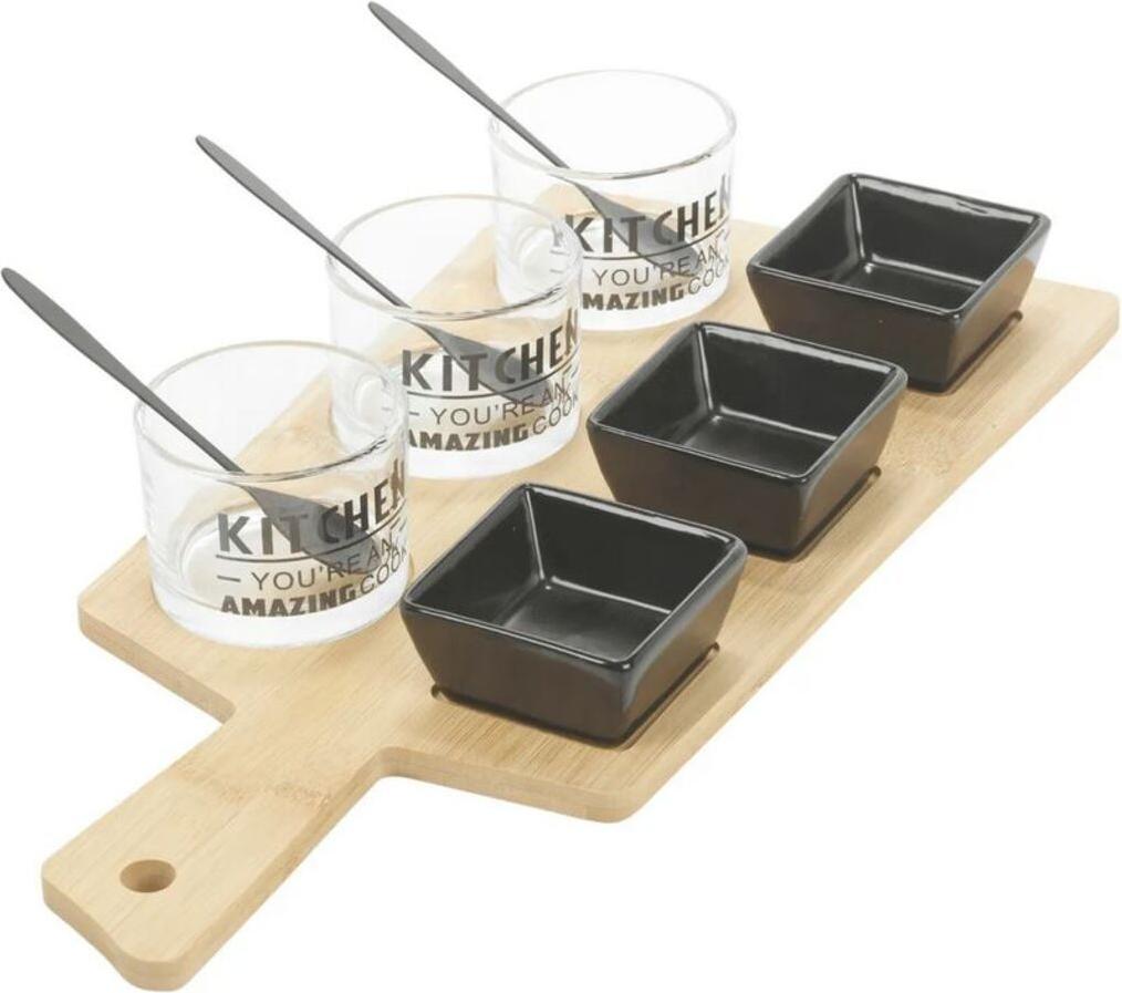 Stilecht Beilagen präsentieren: Das geht hervorragend mit diesen Schälchen auf einem Servierbrett aus Holz. 3 Keramik-Schalen und 3 Schälchen aus Glas mit schwarzer Aufschrift - Kitchen, youre an amazing cook - setzen Salate, Beilagen und viele weitere Lebensmittel perfekt in Szene. Ihre trendige Optik wird durch das Servierbrett aus Holz erweitert, welches ihnen einen gekonnt edlen Look verleiht.