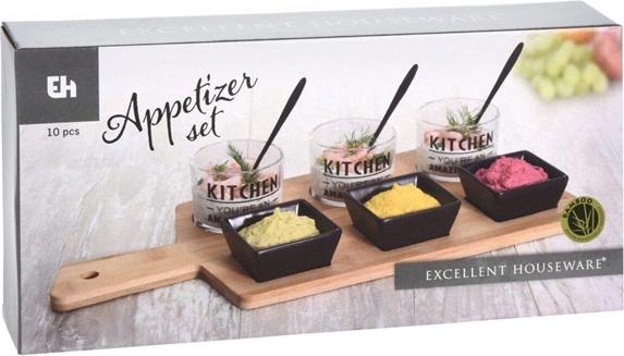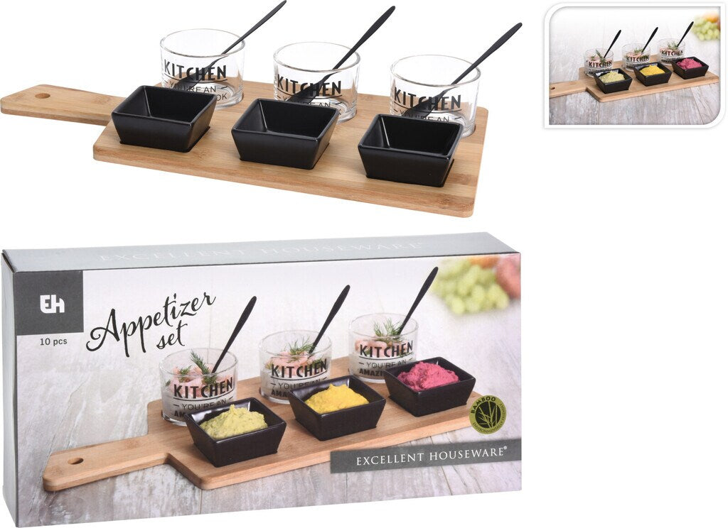 Material Vorspeise-Set: Holz (Servierbrett)/Keramik (3 Schälchen)/Glas (3 Schälchen)/Metall (3 Löffelchen)