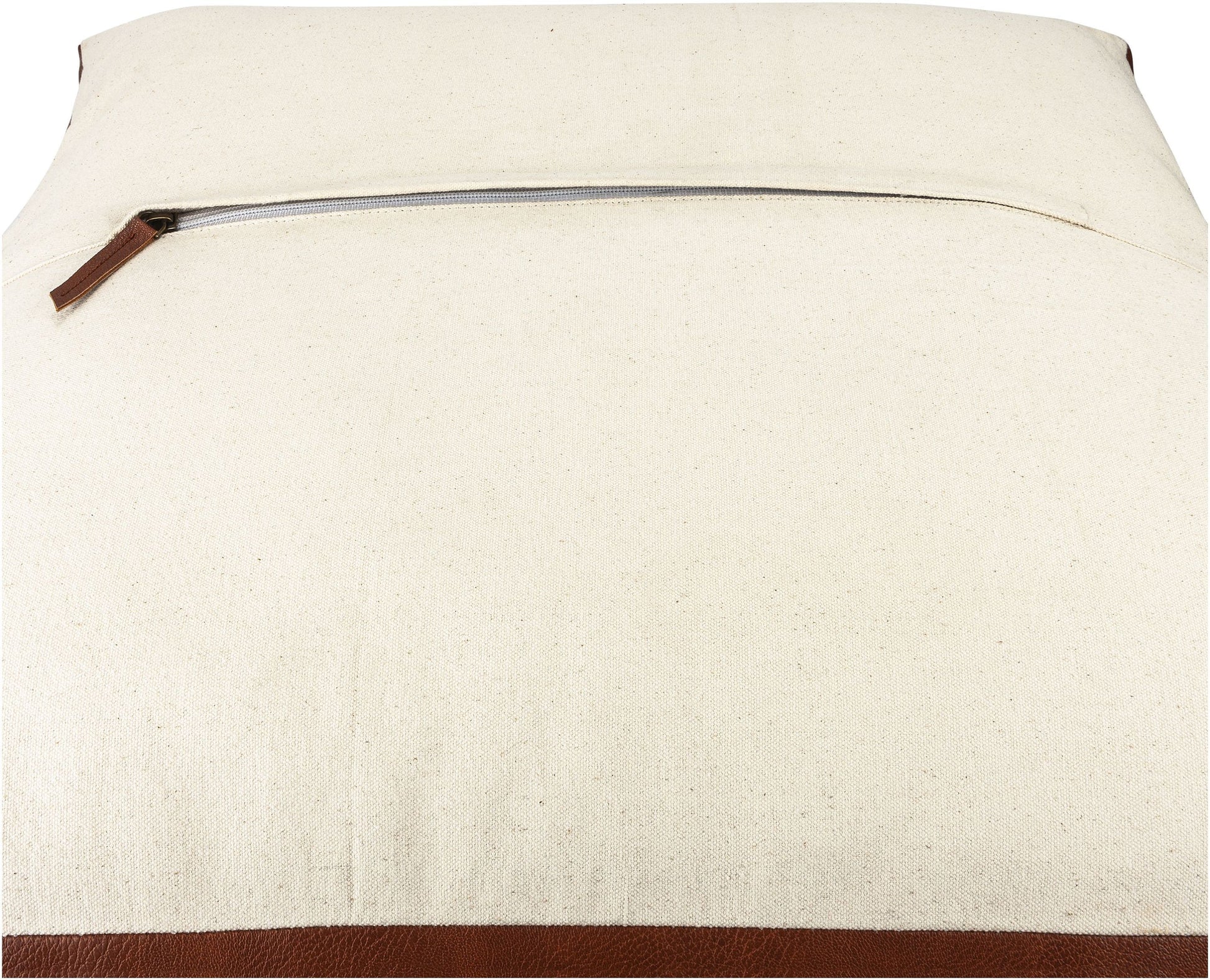 Der Bezug wirkt wie aus echtem Leder gefertigt und weist sogar die typische Struktur auf. Er ist robust und formstabil, an der Oberseite mit Kontrastnähten abgesteppt. Das Innenkissen mit Baumwollfüllung kann entnommen werden.