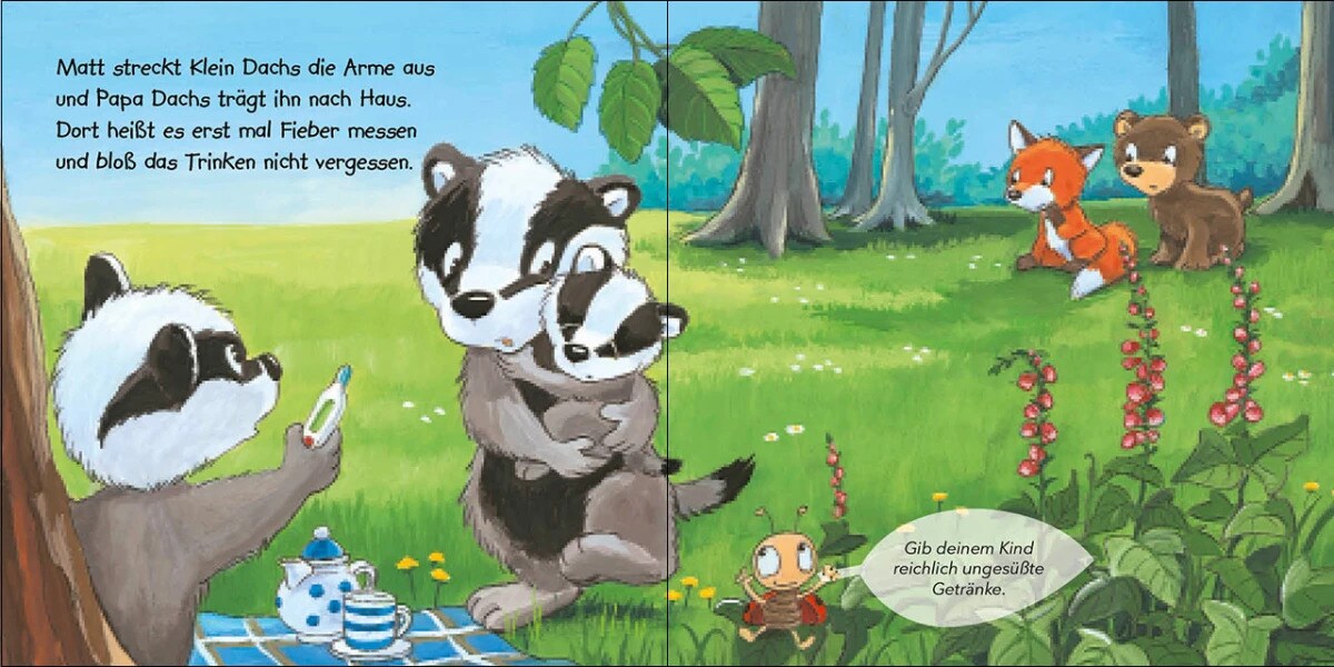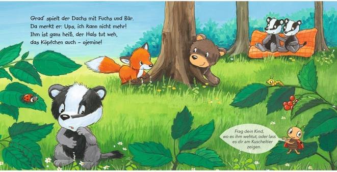 O weh! Eben hat der kleine Dachs noch fröhlich gespielt, da tut ihm plötzlich der Hals weh. Jetzt muss er schnell zum Arzt und dann ab ins warme Kuschelbett. Zum Glück sind seine Familie und Freunde sofort da und kümmern sich um ihn. So wird der kleine Dachs blitzschnell wieder rundum gesund.
