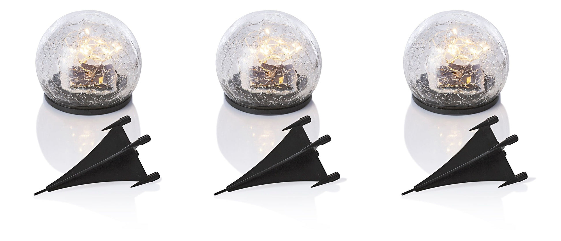 Diese Kugeln aus schickem Effektglas erstrahlen nach Einbruch der Dunkelheit in warmem Licht. Dabei sind sie im Handumdrehen dekoriert! Einfach in die Erde stecken – ob zwischen den Blumen im Vorgarten oder im Balkonkasten, in der Wiese oder entlang des Gartenwegs … Der Erdspieß ist abnehmbar, so lassen sich die Kugelleuchten auch aufstellen, z.B. auf dem Terrassentisch oder auf einem kleinen Mäuerchen.
