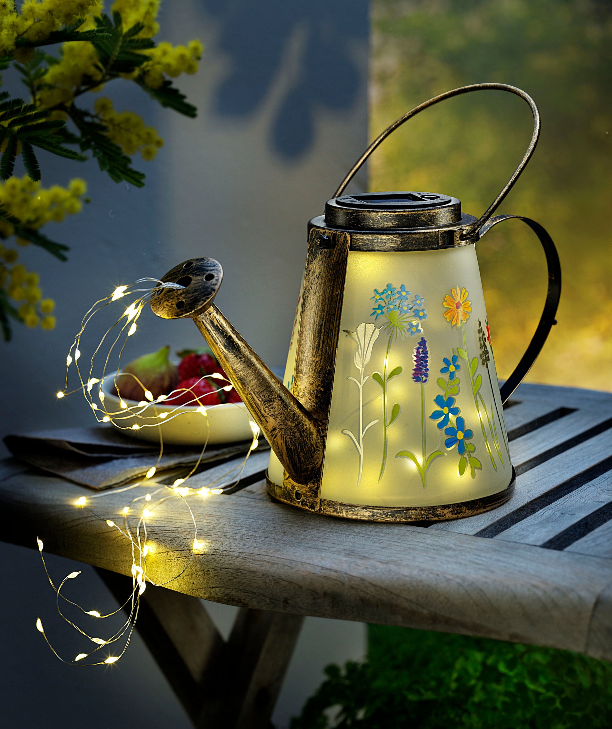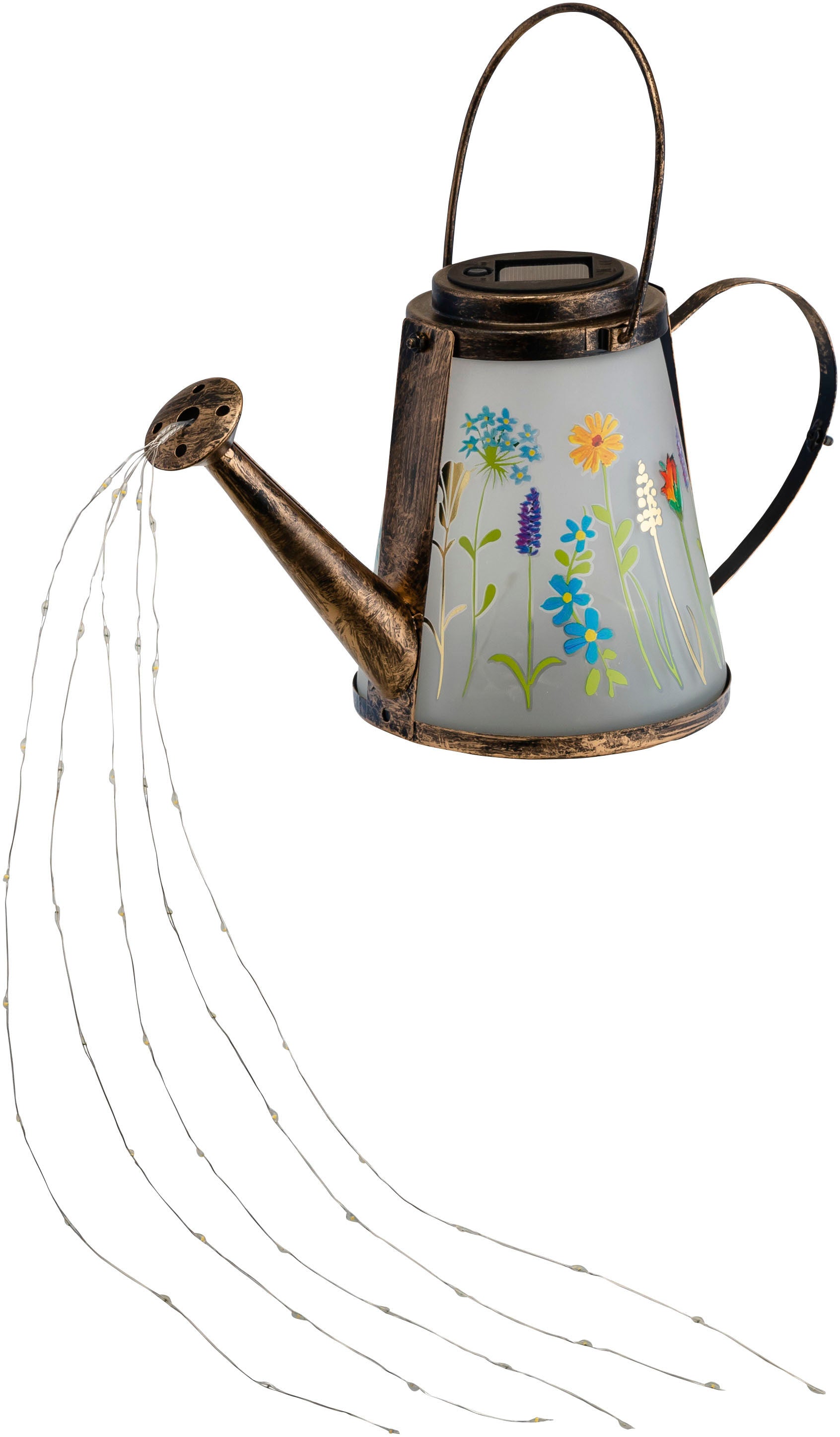- Gießkanne mit Glaseinsätzen, durch die das Licht scheint, und Blumenwiesenmotiv