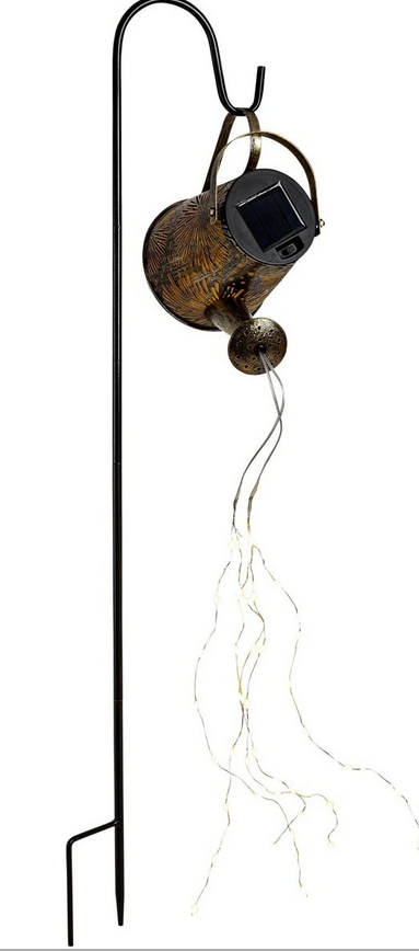 Die Giesskanne ist mit 41 warmweißen LEDs ausgestattet, die tagsüber solarbetrieben sind und abends ein spektakuläres Lichtspiel erzeugen.