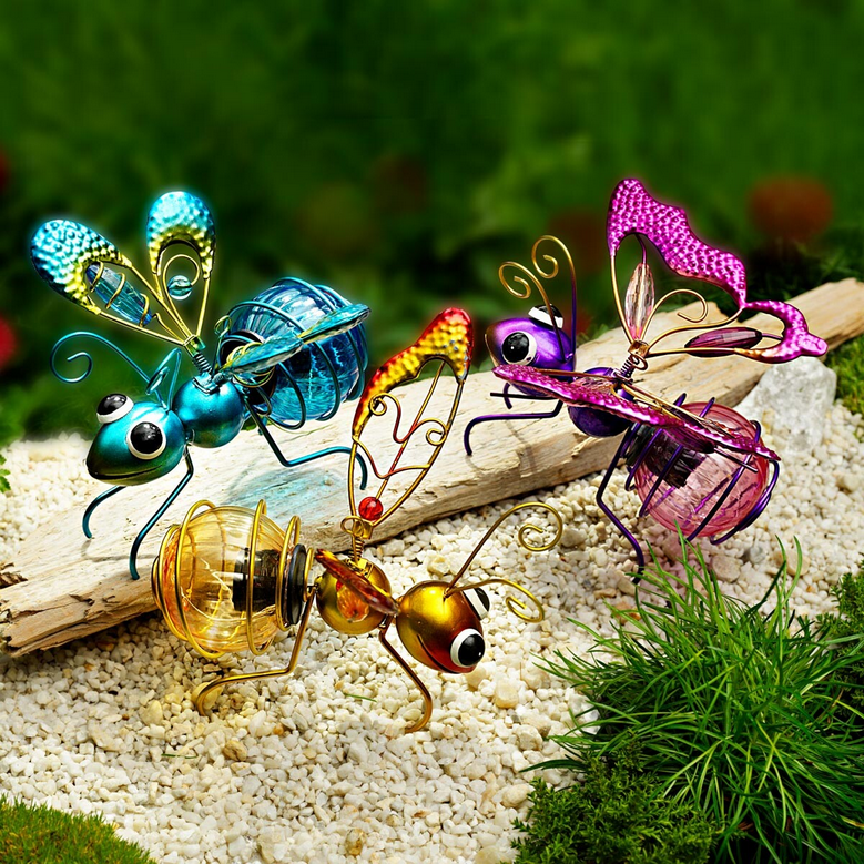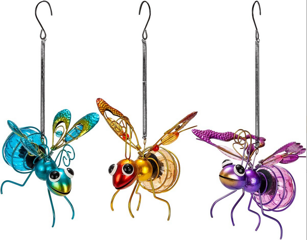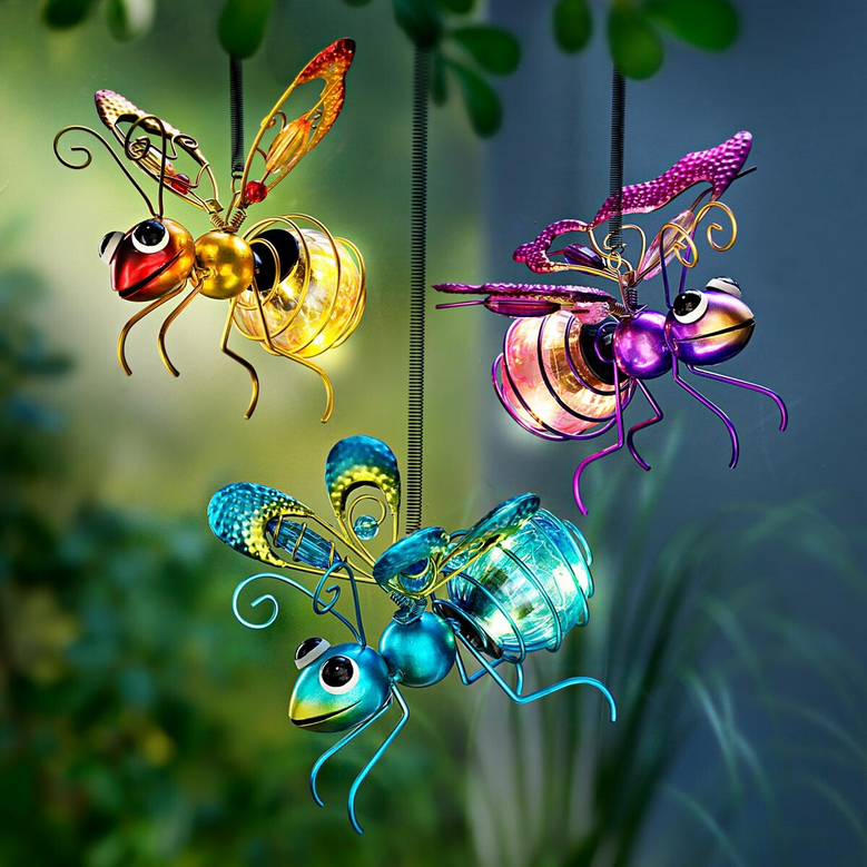 Drei Freunde aus dem Insektenreich - eine Biene, ein Schmetterling und eine Libelle - schlagen abends mit den Flügeln und leuchten dir den Weg. Hängen Sie sie an einen Baum, stupsen Sie sie einfach an oder warten Sie auf einen Windstoss. Die Glaskolben (mit je 3 LEDs) leuchten am Abend. Solarbetrieb (inklusive Knopfbatterie). Material: Metall, Kunststoff. Masse: jeweils ca. 14 x 7 x 14 cm.