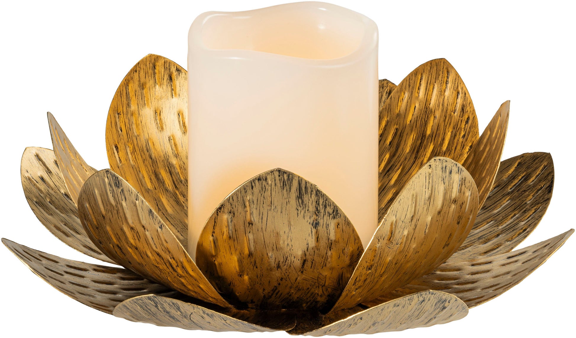 • 2 Kerzenhalter in Form von Lotusblüten, aus goldfarbenem Metall mit feiner Struktur und simulierter Patina