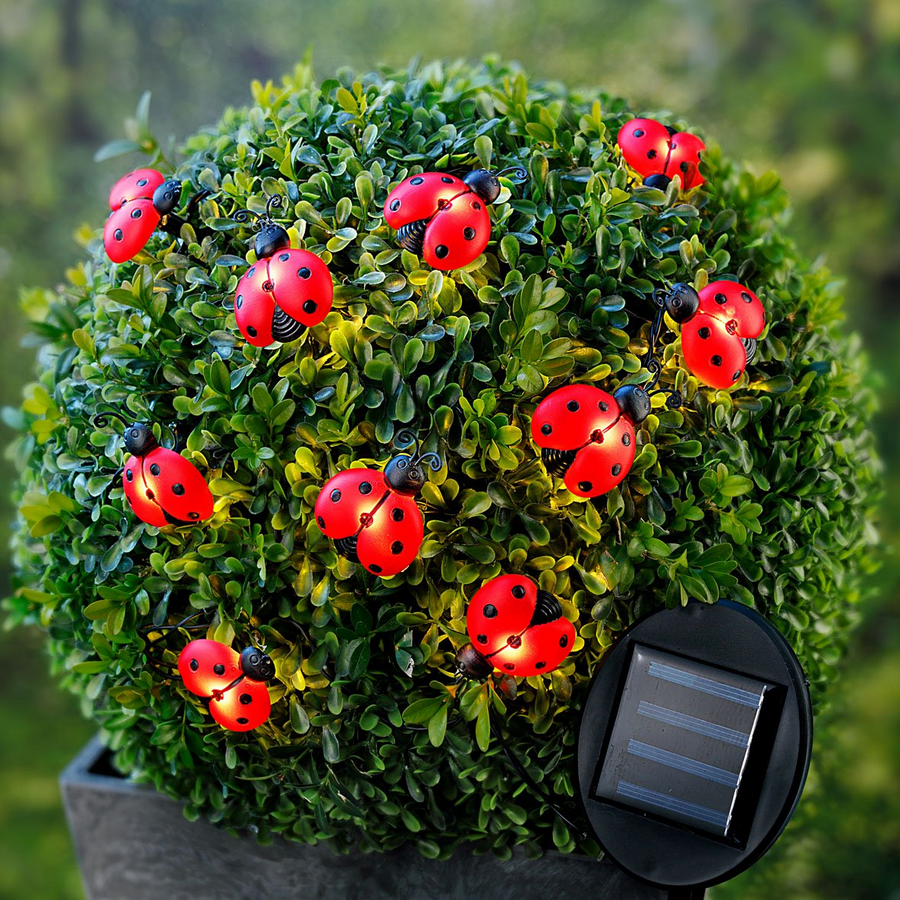 Zehn niedliche, fröhliche Marienkäfer sind perfekt für den Garten, die Terrasse oder den Balkon. Sie leuchten auch nach Einbruch der Dunkelheit in einem sanften Licht.