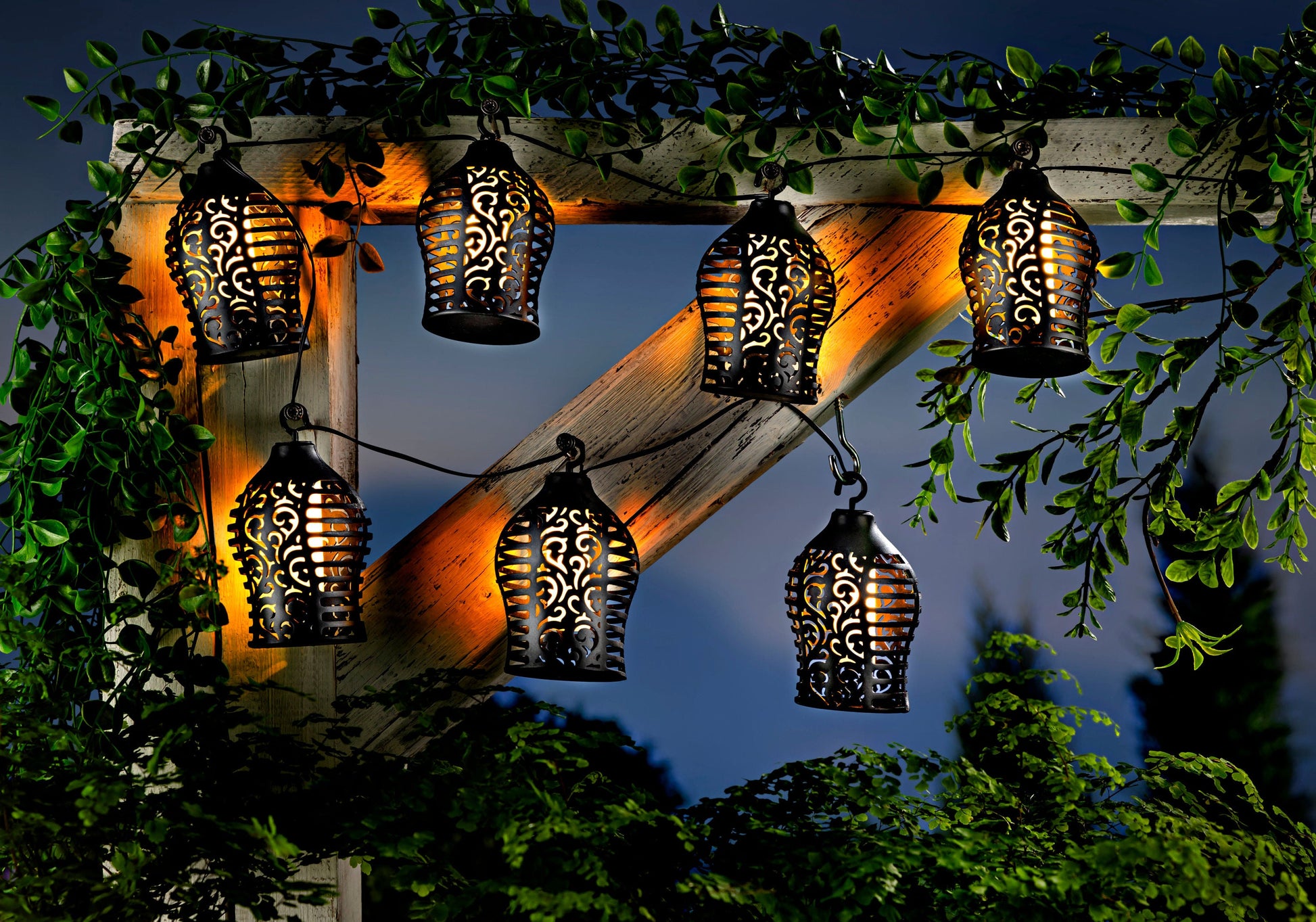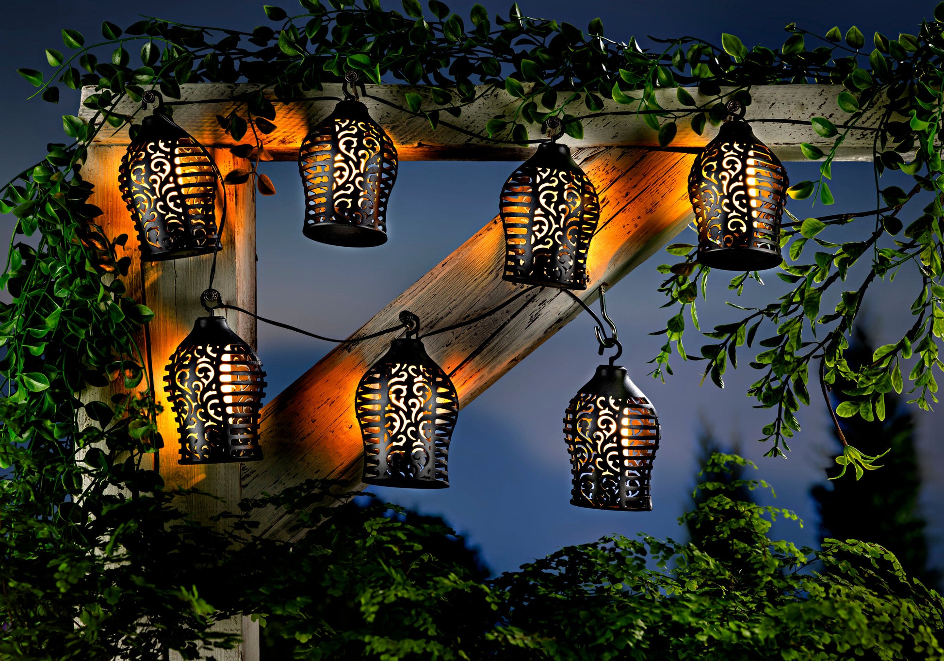 Die sieben Leuchten sind mit kleinen Haken ausgestattet und können dadurch besonders einfach befestigt werden. Dann nur noch das Solarpanel mit dem Erdspieß an einem hellen Plätzchen in den Boden stecken – fertig. Kaum geht die Sonne unter, können die Lichtspiele beginnen …