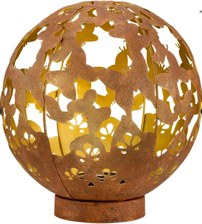 Bringen Sie Ihren Garten oder Ihre Terrasse mit diesem magischen Sonnenball zum Leben! Elegante Silhouetten von Schmetterlingen, die diese schöne Kugel in einem rostigen Look bilden, schaffen ein faszinierendes Spiel aus Lichtern und Schatten. Während die Aussenfläche mit Rost verziert ist, sind die Schmetterlinge im Inneren in Goldfarbe. Sobald es dunkel wird, wird die warmweisse LED im Inneren des Balls den umgebenden Raum mit einem dezenten goldenen Licht beleuchten. Kabel oder Akkus sind nicht nötig. Es genügt, die beeindruckende Dekoration an einen sonnigen Ort zu legen, und wenn die Sonne eingeht, aktiviert sich der Schmetterlingsball dank des integrierten Solarpanels mit einer wiederaufladbaren Batterie. Auch tagsüber ist es eine attraktive Dekoration, die wunderbar in die Umgebung passt.