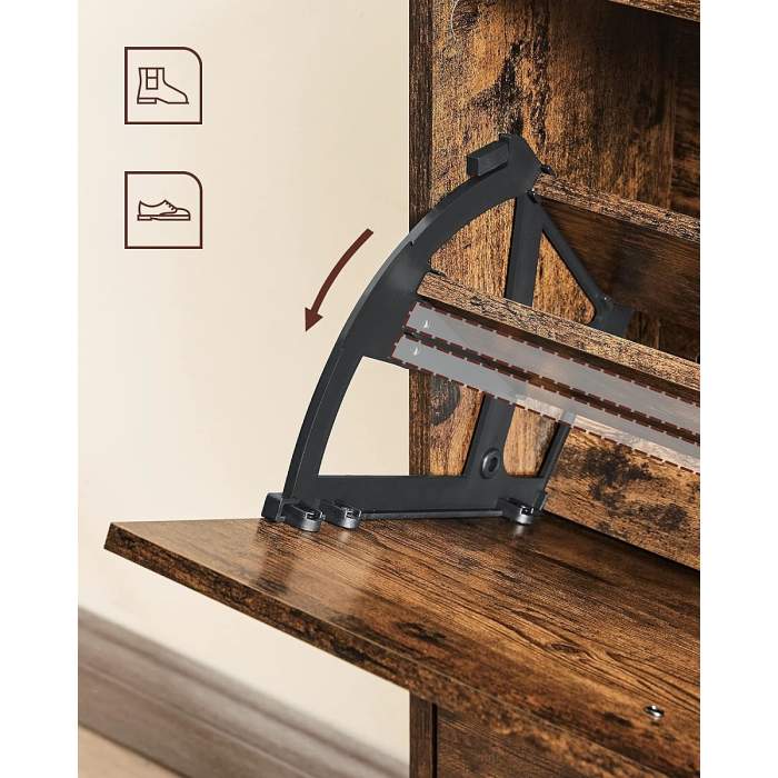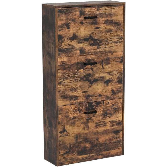 Entworfen mit 3 doppelten Klappschubladen, das clevere Schuhregal hält problemlos 18 Paar Damenschuhe oder 12 Herrenschuhe. Stiefeletten und High Heels? Keine Angst, entfernen Sie einfach die verstellbare Trennwand in jeder Schublade. Die solide Struktur ist durch 3-in-1-Schrauben verbunden, wodurch Abweichungen und Risse durch selbstschneidende Schrauben vermieden werden und die Festigkeit für die kommenden Jahre sicherstellt. Das Anti-Kipp-Set verbessert die allgemeine Stabilität. Das 3-stöckiges Schuhregal mit Klapptüren und einem schlanken Design für Ihre Schuhsammlung ist dank nummerierter Teilen einfach zu montieren. Das Möbel ist eine ideale Möglichkeit, Diele, Schlafzimmer oder Schrank aufzuräumen.