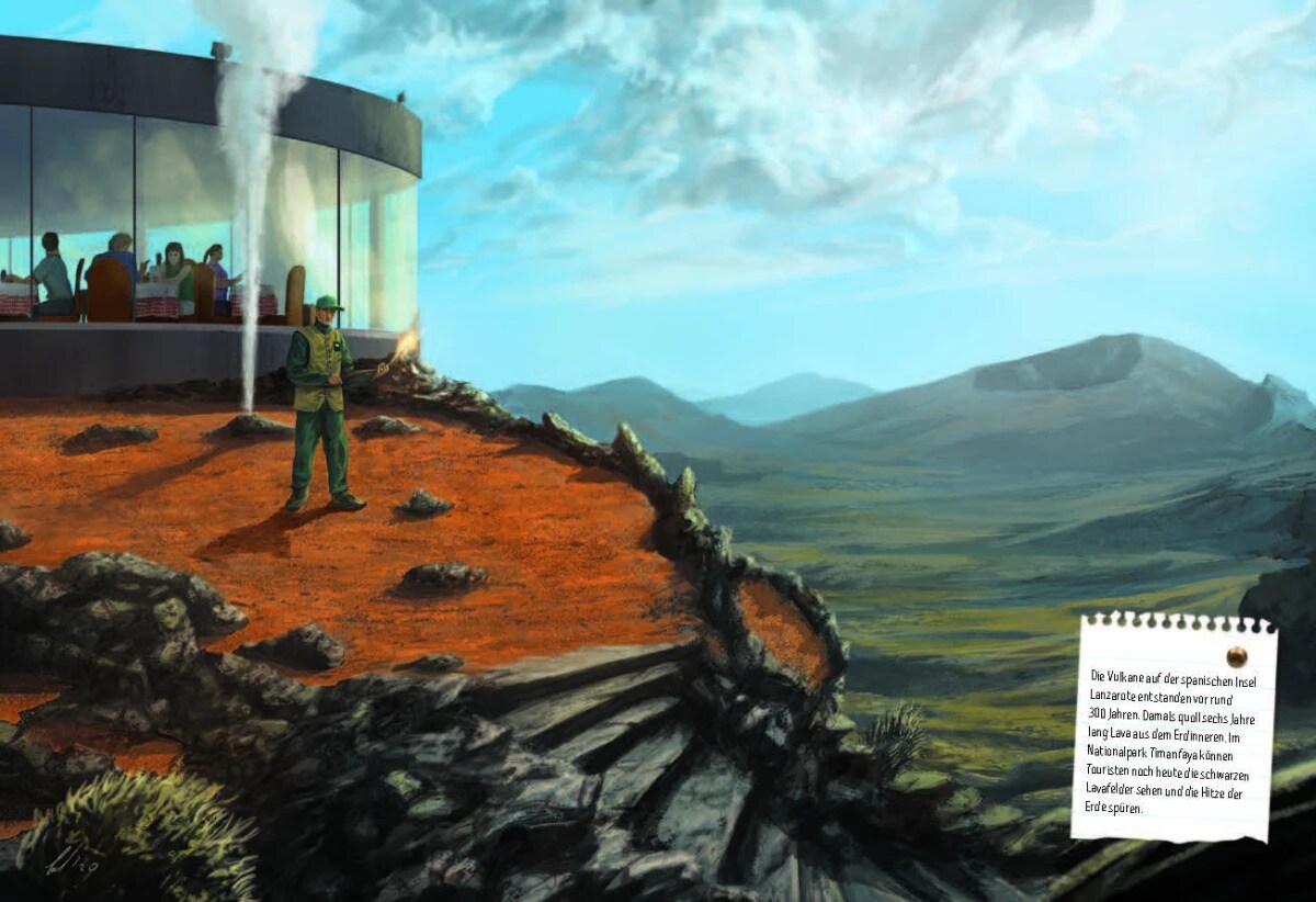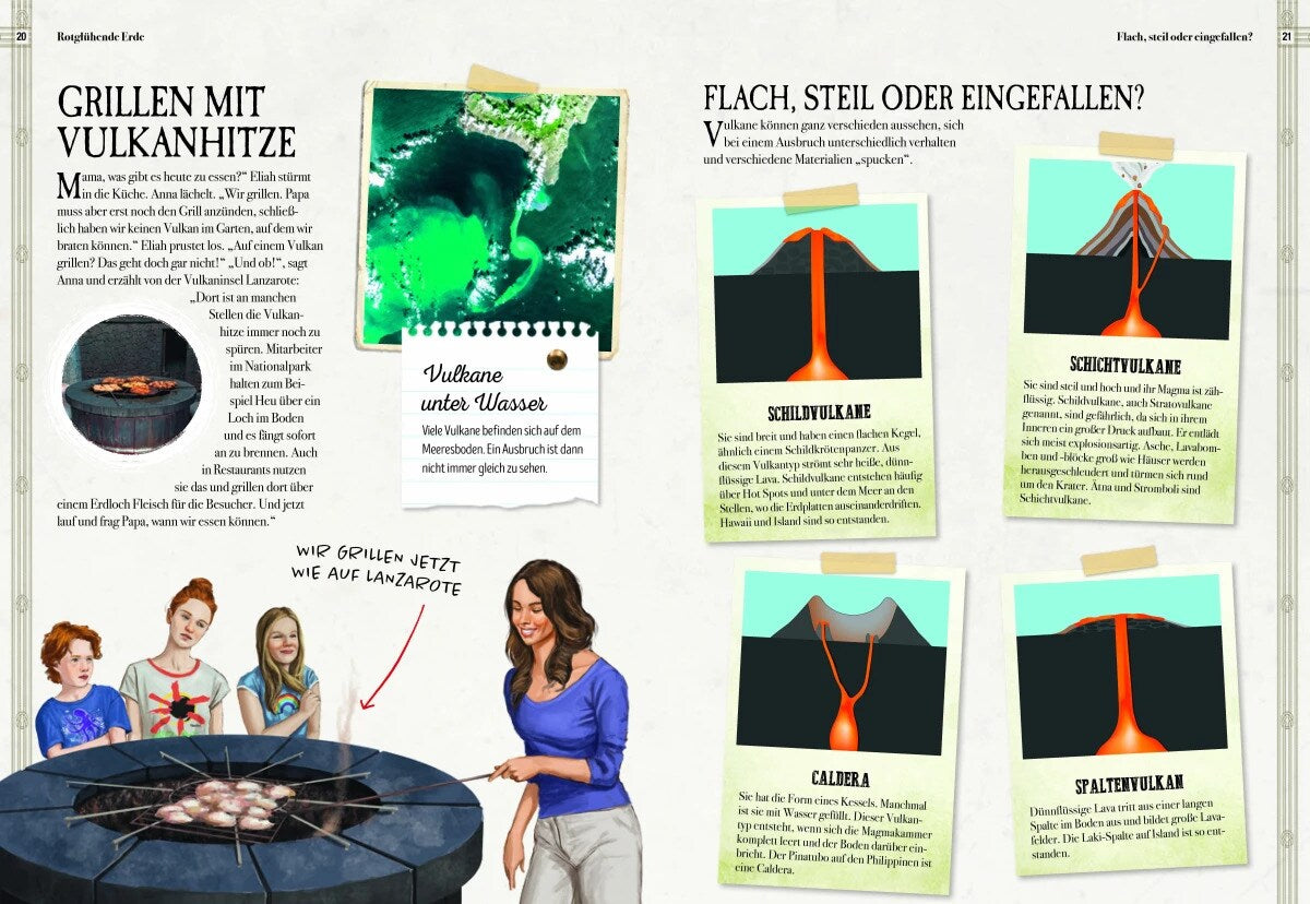 Der Vulkanologe Janos Broder ist viel in der Welt unterwegs und reist häufig zu Vulkanen, die er dann zusammen mit seinen Kolleginnen und Kollegen erforscht. Wenn er zuhause bei seinen drei Kindern ist, löchern sie ihn mit Fragen nach den feuerspeienden Bergen und seinen Erlebnissen dort. Dann erzählt er von seiner Arbeit und berichtet von den Vulkanen, die er gesehen und von Ausbrüchen, die er oder Bewohner des Gebietes erlebt haben. Er liest aus Zeitzeugenberichten, baut Vulkanmodelle und nimmt mit seinen Erzählungen die Kinder mit auf eine Reise zu den am meisten beeindruckenden Vulkanen der Welt. In dem letzten Kapitel erfährt das Kind mehr über die Ausrüstung und konkrete Arbeit einer Vulkanologen, die dazu notwendige Kompetenzen und kann sogar eine Bewerbung zu einem Praktikum bei einem Vulkanologischen Institut zusammenschreiben