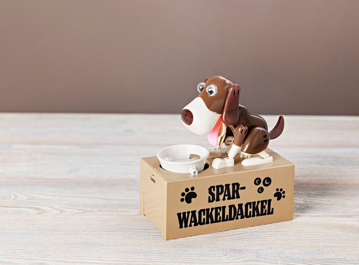 Wuff! Mit dieser Spardose bekommt das Geld sparen einen ganz neuen Anreiz. Denn auf der Spardose sitzt ein lustiger braun-weißer Hund. Und jedesmal, wenn eine Münze in seinem Napf landet, steht er auf und "schlabbert" sie weg - besser gesagt, landet sie dann im Inneren der Spardose. Immer wieder lustig anzusehen.