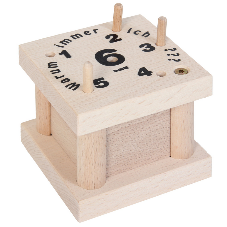 Beliebtes Würfelspiel für zwei und mehr Personen jeden Alters. So geht es: Alle Holzstäbe werden an die Spieler verteilt. Würfelnd werden die Felder des Spielbretts entsprechend der Augenzahlen besetzt. Bei 6 fällt das Stäbchen durch. Ist ein Feld bereits besetzt, muss der Spieler den Stab nehmen, und der Nächste ist dran. Wer keine Holzstäbe mehr hat, gewinnt. Und bald werden Sie wissen, warum das Spiel Warum immer ich? heißt!