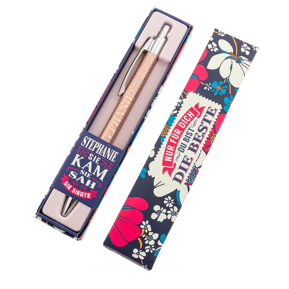 Zu jedem Anlass ein hochwertiger Kugelschreiber eine aufmerksame Geschenkidee – vor allem, wenn er mit dem Namen des Beschenkten personalisiert ist. Unsere ansprechende Auswahl an Kulis, in edlem Geschenketui mit originellem Spruch, wird stilbewusste Ladies und echte Kerle begeistern. Ausdrucksstarke, maskuline Designs mit insgesamt 50 Männernamen, feminine Muster für die 50 Frauennamen und 20 allgemeine Titel machen das neue Sortiment an kreativ gestalteten H&H Kugelschreibern aus. Die Kulis liegen angenehm in der Hand und sorgen für ein elegantes Schriftbild.