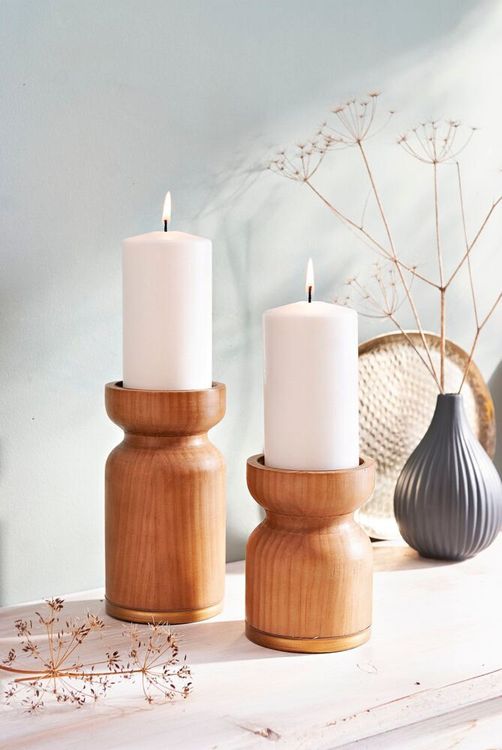Kerzenhalter aus fein gemasertem Kiefernholz Höhe 18 cm Dezent mit Gold abgesetzt Vielseitig und langlebig Für Kerzen bis Ø 7,5 cm Stumpenkerzenhalter Legno (Größe 18 cm) - Deko-Basic für viele Gelegenheiten Auch Deko-Neulinge können mit diesem Kerzenhalter aus Kiefernholz nichts falsch machen. Ebenso dezent wie geschmackvoll fügt sich dieses Deko-Basic in jedes Ambiente ein und verbreitet im Nu behagliche Wohnlichkeit. Und auch wer nur selten und zurückhaltend dekoriert, wird an diesem Kerzenhalter lange Freude haben, denn er ist vielseitig einsetzbar und weder Form noch Material sind der Mode unterworfen. Vielseitig dekorierbar jahraus, jahrein Im Mittelpunkt eines Adventsgestecks nimmt sich der Stumpenkerzenhalter Legno ebenso gut aus wie in einem Osterkranz oder zusammen mit einem sommerlichen Blumenstrauß. Zwischen Bilderrahmen auf dem Kaminsims oder dem Sideboard kommt er ebenso gut zur Geltung wie als einfache Tischdeko. Der Echtholz-Allrounder passt zu bunt gemusterten Frühlingskerzen ebenso wie zu goldschimmernden Weihnachtskerzen und vermittelt mit schlichten naturfarbenen Kerzen rund ums Jahr eine wohnliche Atmosphäre. Dezente Eleganz und natürlicher Charme Das Kiefernholz ist fein bearbeitet und die Oberfläche geschmeidig und glatt wie ein Handschmeichler. Der untere Rand des Kerzenhalters ist dezent mit goldfarbenem Metall verstärkt, was für einen sicheren Stand sorgt und dem Naturmaterial gleichzeitig einen Hauch von Eleganz verleiht. Der etwas tieferliegende Kerzenteller besteht ebenfalls aus goldfarbenem Metall. Damit punktet der Kerzenständer nicht nur, was die Sicherheit betrifft, sondern er lässt sich so auch leichter reinigen und von Wachsresten befreien. Tipp: Bestellen Sie gleich mehrere der Stumpenkerzenhalter Legno in verschiedenen Größen und dekorieren Sie zwei oder drei Stück zu einem schmucken Lichterensemble. Stumpenkerzenhalter Legno (Größe 18 cm): -Kerzenhalter aus Kiefernholz -Mit Metallapplikation (Fuß und Kerzenteller) -Passend für Kerzen bis Ø 7,5cm -Mit Designer-Label am Boden -Maße 9,5 x 18 cm (Ø x Höhe) Bestellen Sie jetzt den Stumpenkerzenhalter Legno (Größe 18 cm) ein Stück, an dem Sie lange Freude haben werden!