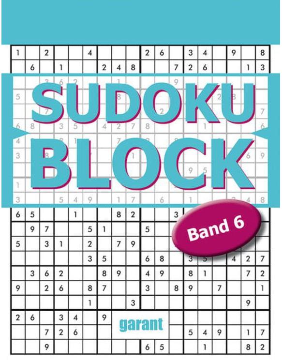 Das aus Japan kommende Rätsel Sudoku besteht aus neun quadratischen 3 x 3-Blöcken, wobei jeder quadratische Block in drei Reihen mit jeweils drei Kästchen unterteilt ist. In jedem quadratischen 3 x 3-Block sind Zahlen zwischen 1 und 9 vorgegeben. Diese vorgegebenen Zahlen gilt es so zu ergänzen, dass jede Zahl zwischen 1 und 9 nur einmal vorkommt. Auch in den neun Spalten und neun Zeilen des gesamten Sudoku Rätsels dürfen die Zahlen von 1 bis 9 nur einmal vor kommen. Die Sudoku-Rätsel sind in die Schwierigkeitsstufen leicht, mittel und schwer und sehr schwer eingeteilt. Der große Block enthält jeweils auf der Rückseite die Lösung zum vorhergehenden Rätsel - für jede Menge Rätselspaß.