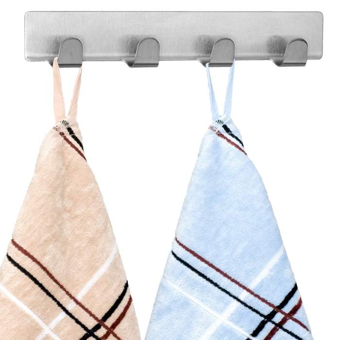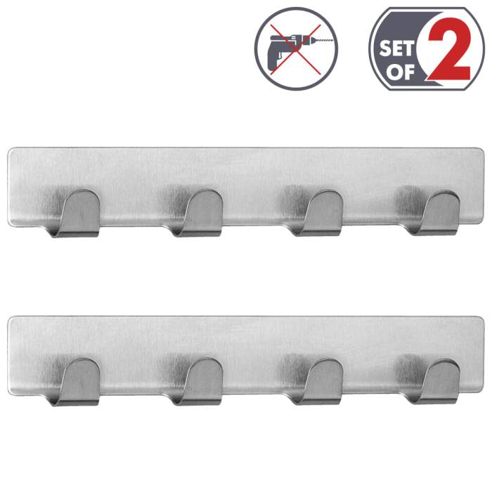 Set aus 2 leistungsstarken Handtuchhaltern aus Edelstahl mit je 4 Haken. Starker Halt bis zu 5 kg, ideal für Geschirrtücher und Handtücher. Der Halter lässt sich leicht an jeder flachen Oberfläche befestigen. Modernes Design, geeignet für Haus, Büro oder Garage. Die Montage geht fix und einfach durch den superstarker selbstklebender Verschluss, wasserabweisend und langlebig
