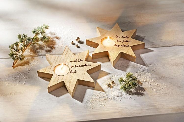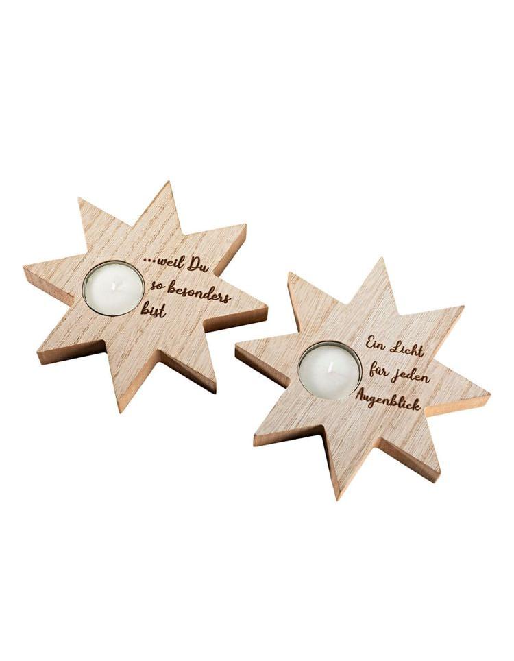 Himmlische Lichtdeko mit lieber Botschaft 2er-Set, Ø 16 cm Sterne aus Holz mit graviertem Spruch Inkl. 2 Teelichtern Als Geschenk, Mitbringsel, Dekoration Teelichthalter Augenblick : 2 Sternen-Lichter für Ihre Lieben Ein Licht für jeden Augenblick und weil Du so besonders bist die gravierte Botschaft macht die Holzsterne zu ganz persönlichen Präsenten. Und natürlich machen sich diese Teelichthalter auch in Ihrem Wohnambiente gut, ob einzeln oder als Duett. Durch ihr zurückhaltendes Design im angesagten Naturlook passen diese Sterne zu jeden Einrichtungsstil, ob modern und pur, klassisch oder romantisch-verspielt. Im Set sind die Teelichter bereits enthalten, so sind die Sternhalter gleich bereit zum Verschenken oder Mitbringen, z.B. als Dankeschön für eine Einladung, als Mutmacher oder Trostpflaster, als liebe Aufmerksamkeit für zwischendurch oder zum Wichteln T eelichthalter Augenblick 2er-Set: Sterne aus MDF-Holz je mit Aussparung für ein Teelicht mit graviertem Spruch jeweils inkl. Teelicht, Brenndauer ca. 3 Stunden Maße Teelichthalter: Ø 16 cm, Höhe 2 cm Wie schön, so einen wunderbaren Lichtbringer zu bekommen! Ob zum Verschenken oder für Sie selbst: Das 2er-Set Teelichthalter Augenblick bestellen Sie klickschnell hier bei uns im Onlineshop.