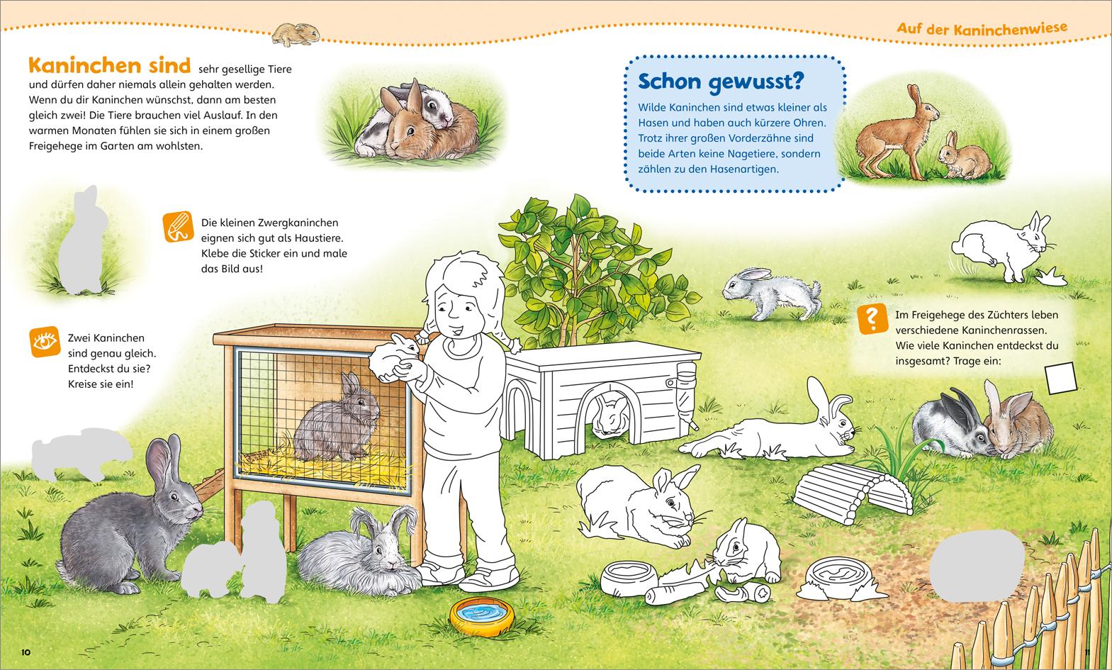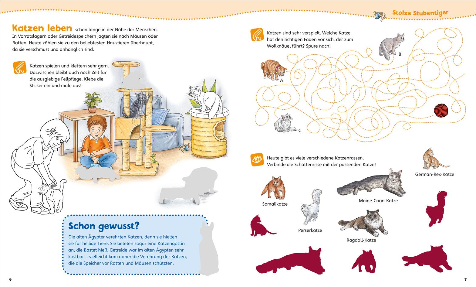 Welcher Faden führt die Katze zum Wollknäuel? Was braucht ein Kaninchen zum Glücklichsein? Und wie bunt soll das Gefieder der Nymphensittiche leuchten? Mit den spannenden Rätseln und Denkaufgaben sowie liebevoll gestalteten Malvorlagen in diesem Mitmach-Heft lernen Kinder ab 4 Jahren die beliebtesten Haustiere und deren artgerechte Haltung auf spielerische Art kennen. Von-Punkt-zu-Punkt einen Kratzbaum erschaffen, die Bildausschnitte auf der Hundewiese zuordnen oder das Meerschweinchen-Sudoku lösen - die mit leicht verständlichen Sachinformationen gespickten Aufgaben laden die Kinder ein, die Seiten aktiv mitzugestalten. Viele bunte Sticker von Hunden und Katzen, Hamstern und Meerschweinchen sowie Fischen und Vögeln können die kleinen und großen Haustierfreunde auf die grau hinterlegten Stellen im Heft kleben oder andere Gegenstände damit schmücken.