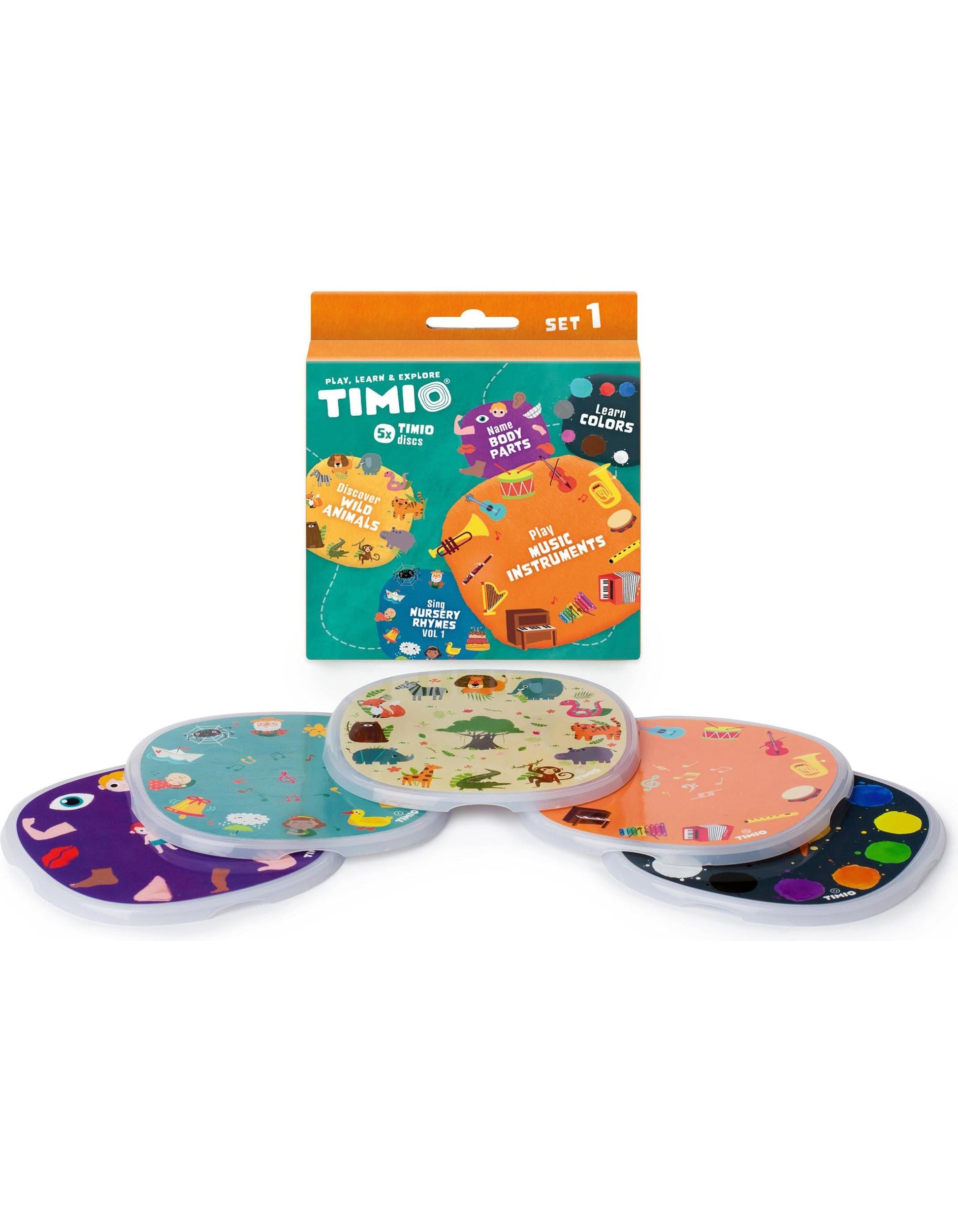 Timio Audio Disc Set 1 - für den Timio Audio und Musikplayer für Kinder. Das Set 1 besteht aus 5 Magnetplatten, um eine Bibliothek ausgewählter Inhalte freizuschalten. Dieses Set beinhaltet die Discs Wildtiere, Musikinstrumente, Farben, Kinderreime Vol.1 und Körperteile. Sammle alle Discs um deine Bibliothek zu vervollständigen.
