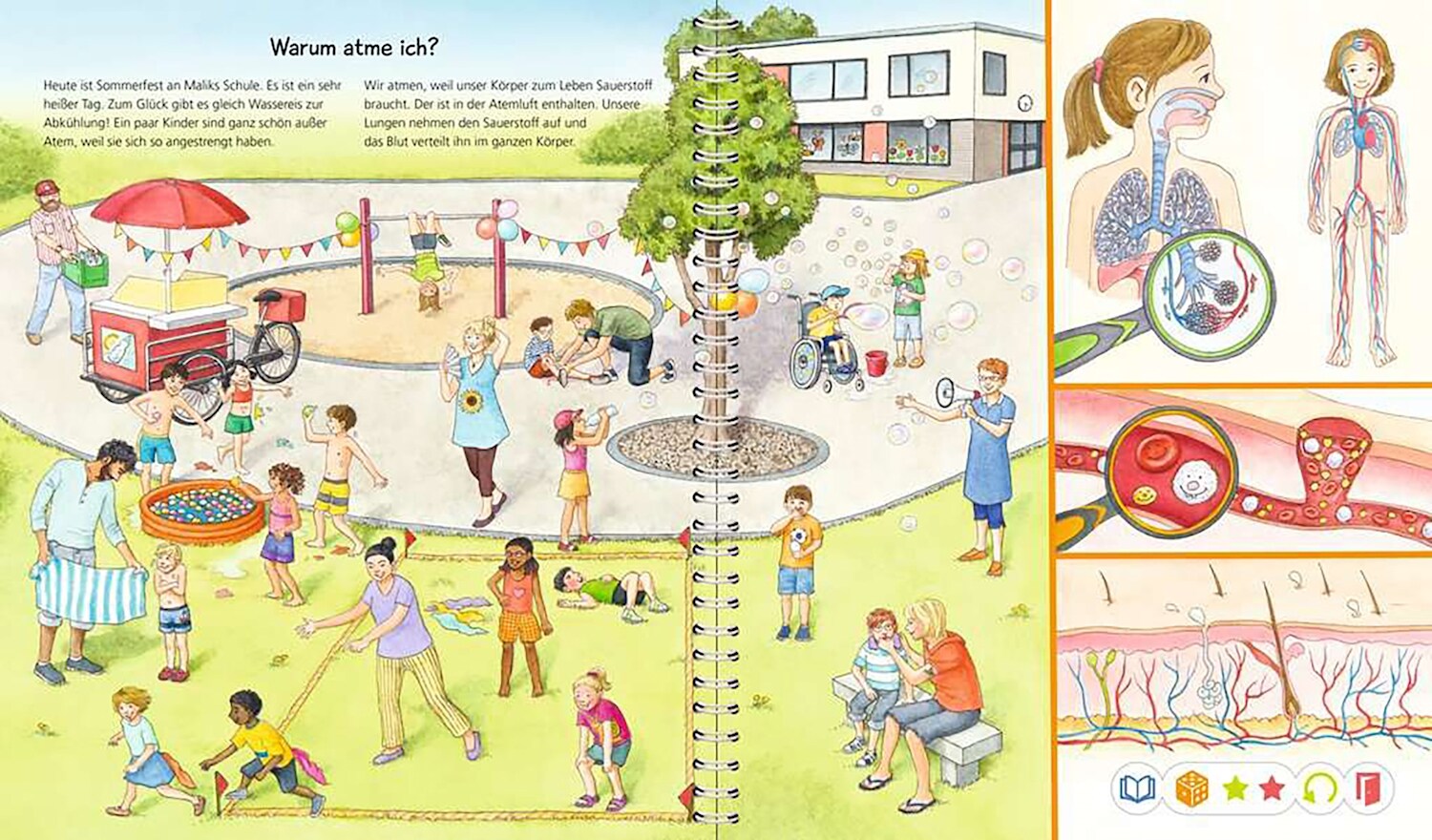 Welches sind die kleinsten und größten Knochen des Körpers? Warum schwitze oder friere ich? Und was tut dem Körper gut? In diesem Buch erfahren Kinder allerhand Wissenswertes über die verschiedenen Bestandteile des menschlichen Körpers. Anhand von Szenen aus dem Kinderalltag erklärt tiptoi den kleinen Entdeckern, wie ihr Körper funktioniert: Beim Seifenblasenpusten ist die Lunge im Einsatz, nach der Wasserschlacht haben die Kinder Gänsehaut und auf dem Klettergerüst sind Muskeln gefragt.