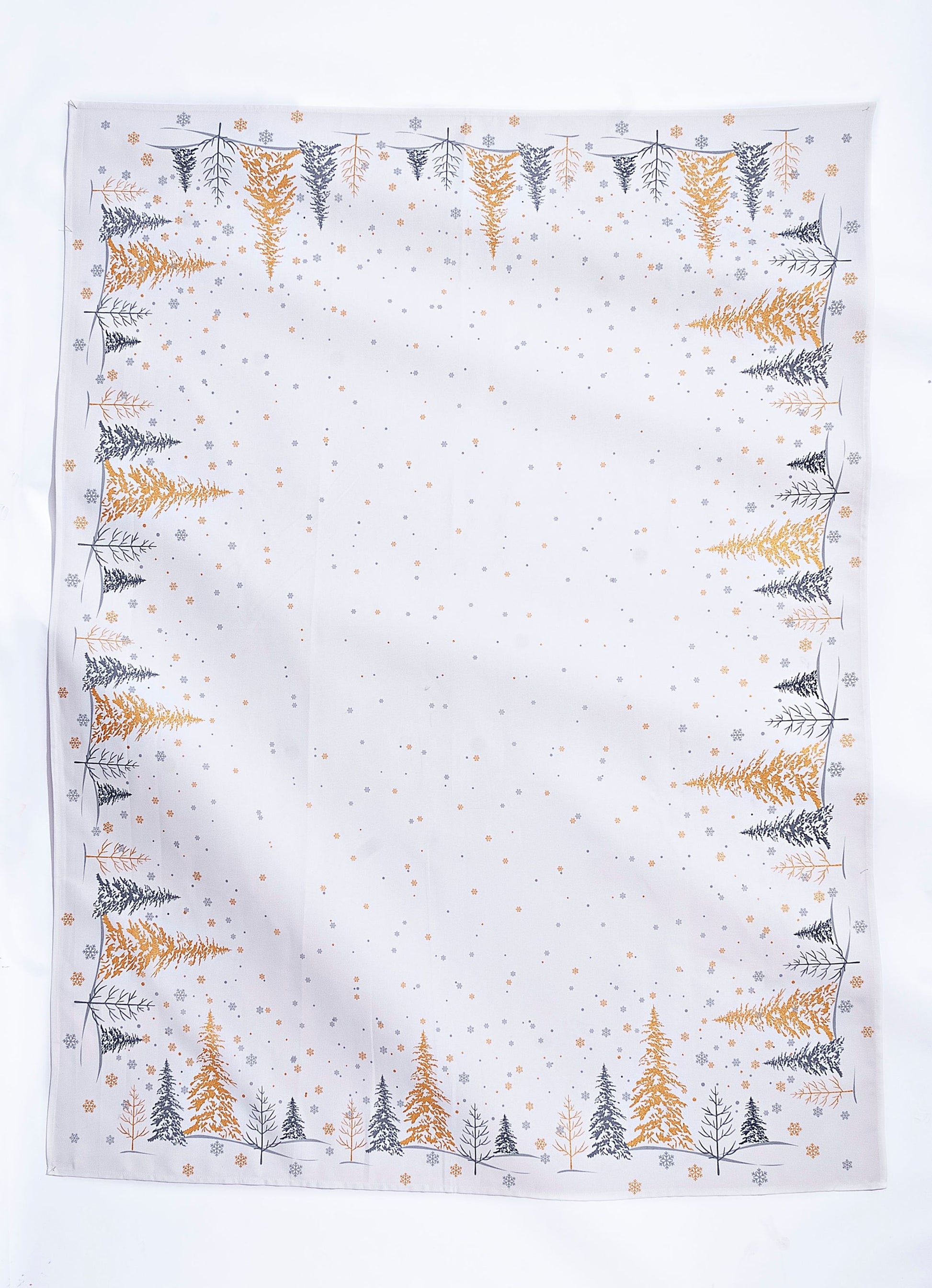 Mit dieser grossen Tischdecke kommt im Nu Winterromantik und Festtagsstimmung auf! Rundherum ist ein winterlicher Wald zu sehen - und leise "rieselt" dazu der Schnee … Die Tannen und Schneeflocken glänzen grau und goldfarben - perfekt am Weihnachtsabend, aber auch den ganzen Winter über geeignet. Die Tischdecke macht Ihre Tafel im Handumdrehen zum bildschönen Blickfang - ideal auch als Geschenk!