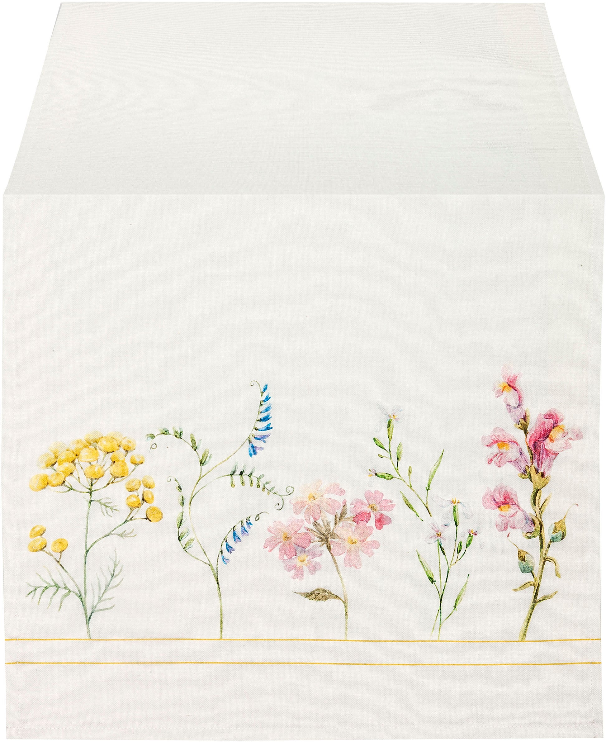 Das bildschöne Motiv wird Sie begeistern: An beiden kurzen Seiten blühen auf weissem Grund pinselfein ausgestaltete Wiesenblumen – wie von Künstlerhand gemalt. Die dezenten gelben Linien verleihen den nostalgisch wirkenden Blumen eine moderne Note. Ein zauberhafter Hingucker direkt auf der Tischplatte, auf einer Tischdecke oder in Kombination mit passenden Tischsets.