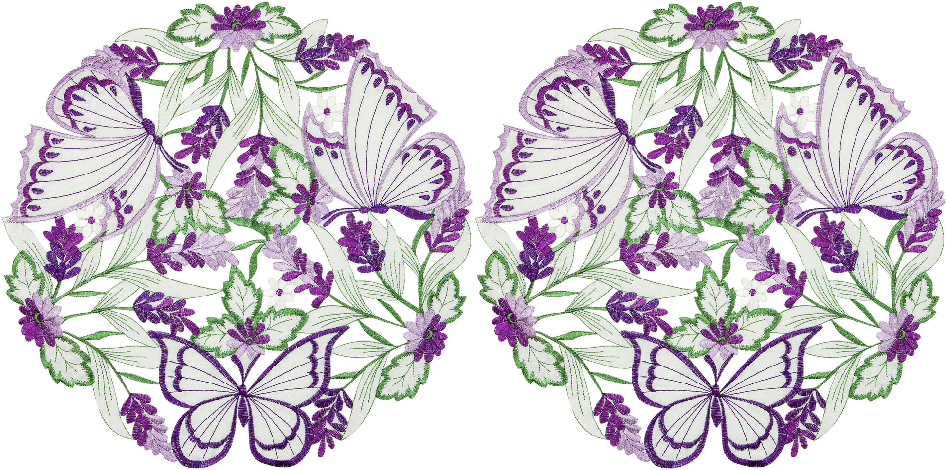 Die beiden textilen Platzmatten sind komplett in aufwendiger Durchbruchtechnik gearbeitet. Auf perlweissem Grund sind die Konturen von Lavendelsträuchern, Blüten, Blättern und Schmetterlingen kunstvoll herausgearbeitet und farbig bestickt. Zusammen mit dem konturierten Rand macht dies aus jedem Tischset ein wahres Schmuckstück, das dennoch alltagstauglich ist. Nach Gebrauch wandern die Sets einfach in die Waschmaschine und machen sich wieder fein für ihren nächsten Einsatz.