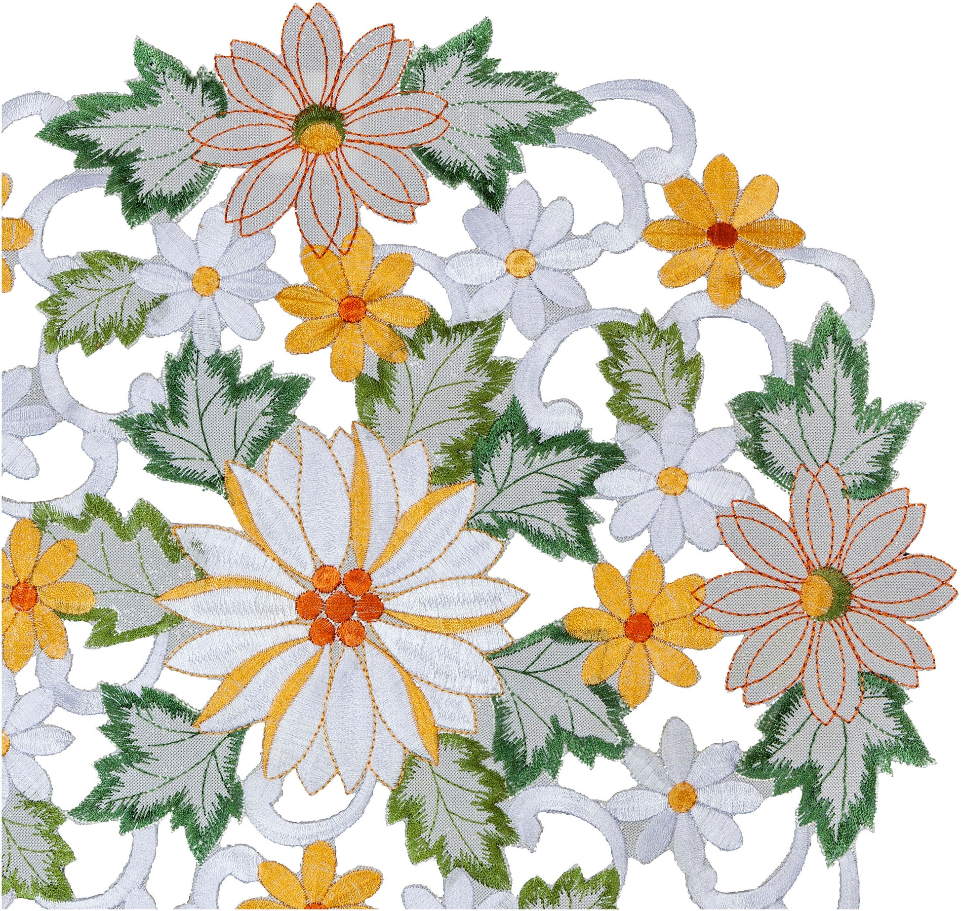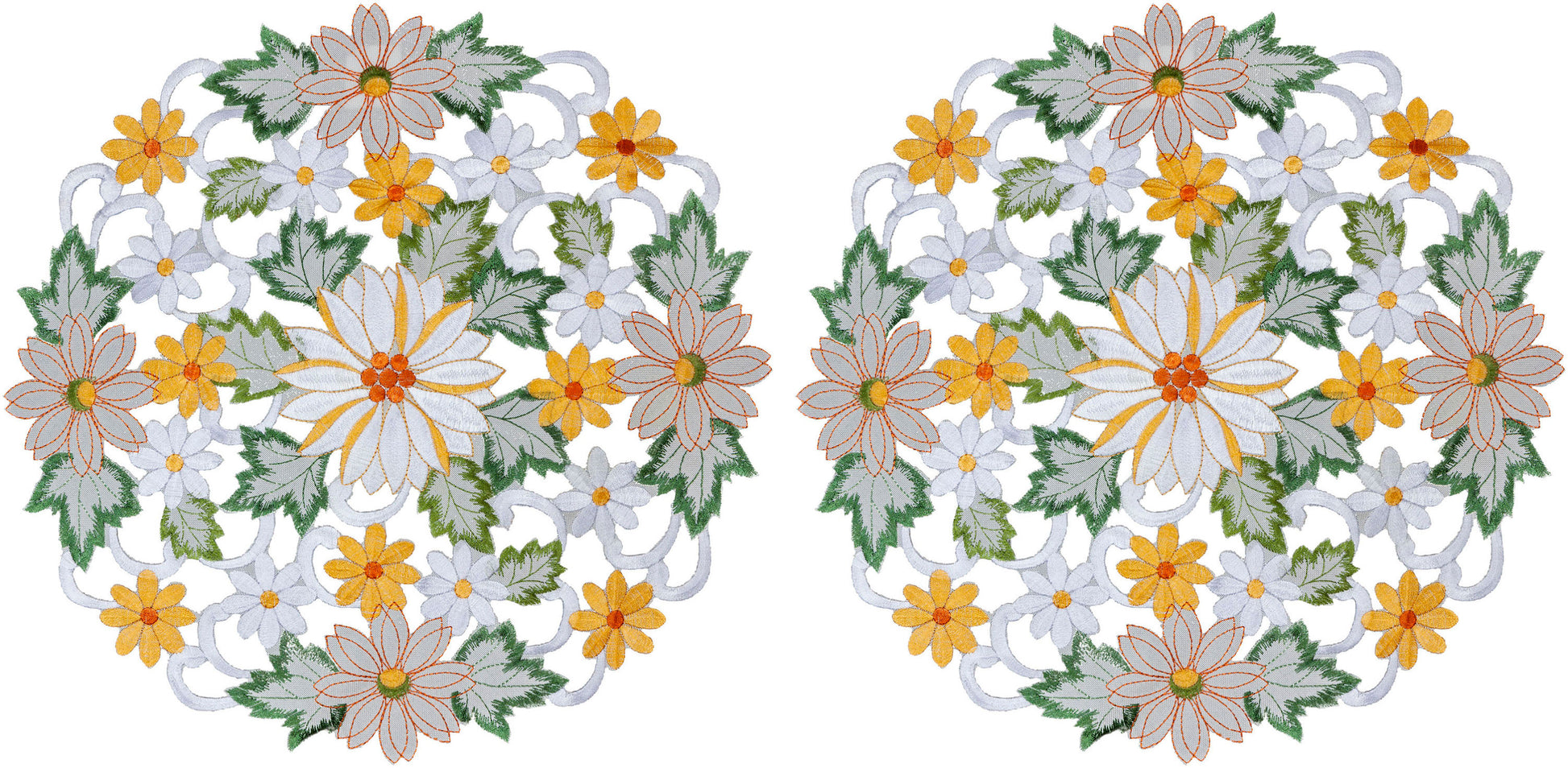 Die Tischsets sind komplett in aufwendiger Durchbruchtechnik gearbeitet. Auf sandfarbenem Grund sind die Konturen von Blumen aufgestickt. Frisches Grün, sonniges Gelb, warmes Orange und klares Weiss lassen eine lebendige Frühlingsatmosphäre entstehen. Einige Blüten sind aufgestickt, andere sind appliziert. Zusammen mit dem konturierten Rand macht dies aus dem Tischset „Spring“ ein wahres Schmuckstück, das dennoch alltagstauglich ist: Das edle Textil-Accessoire können Sie problemlos bei 40° in der Maschine waschen.