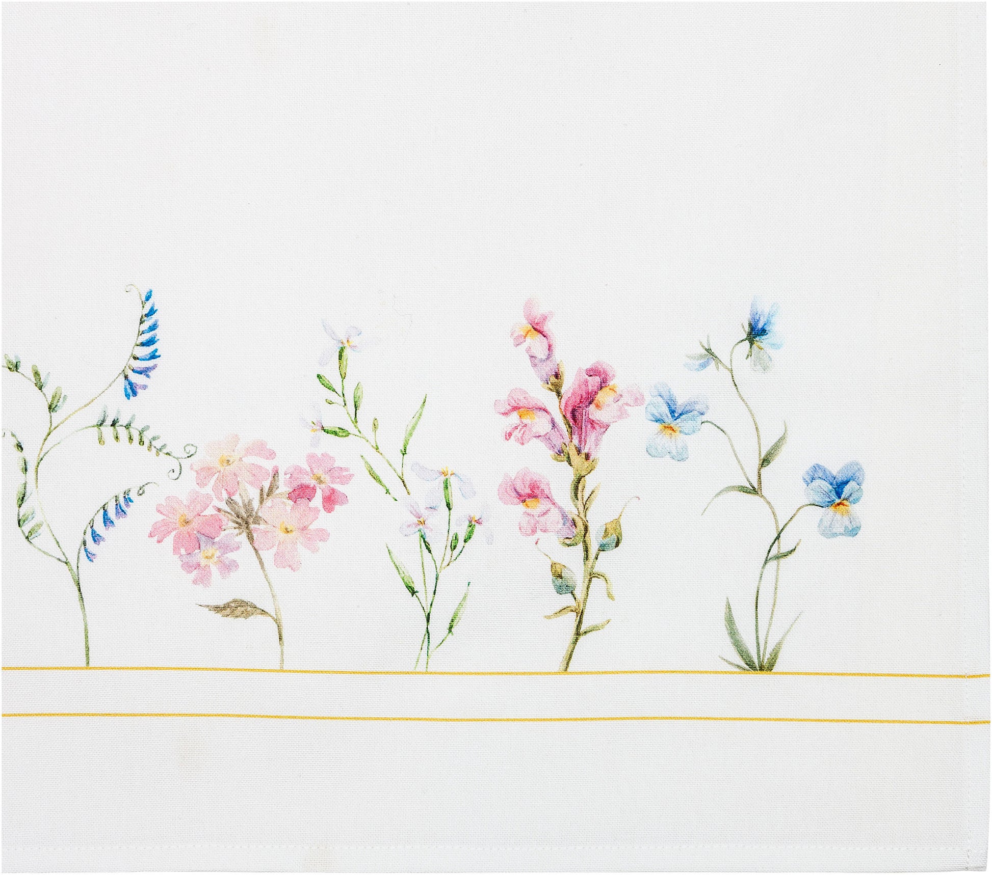 Das bildschöne Motiv wird Sie begeistern: Auf weissem Grund blühen pinselfein ausgestaltete Wiesenblumen, wie von Künstlerhand gemalt. Die dezenten gelben Linien verleihen den nostalgisch wirkenden Blumen eine moderne Note.