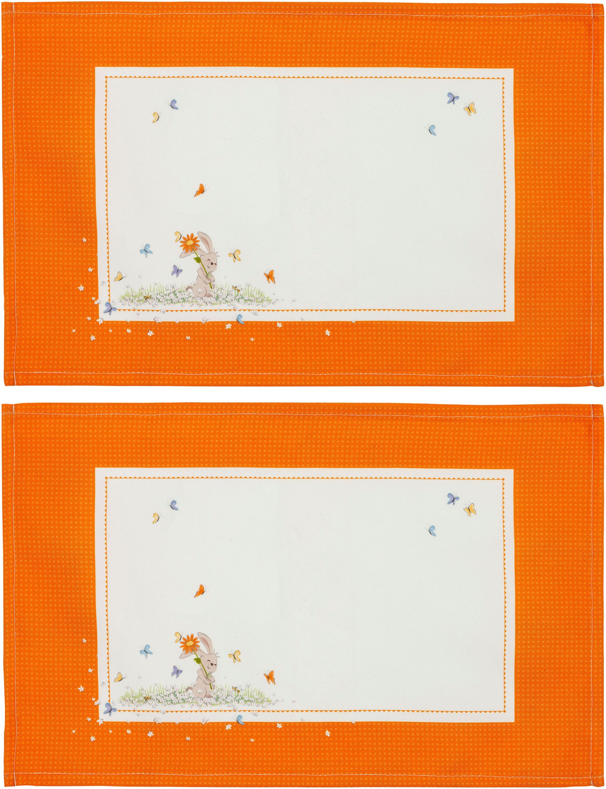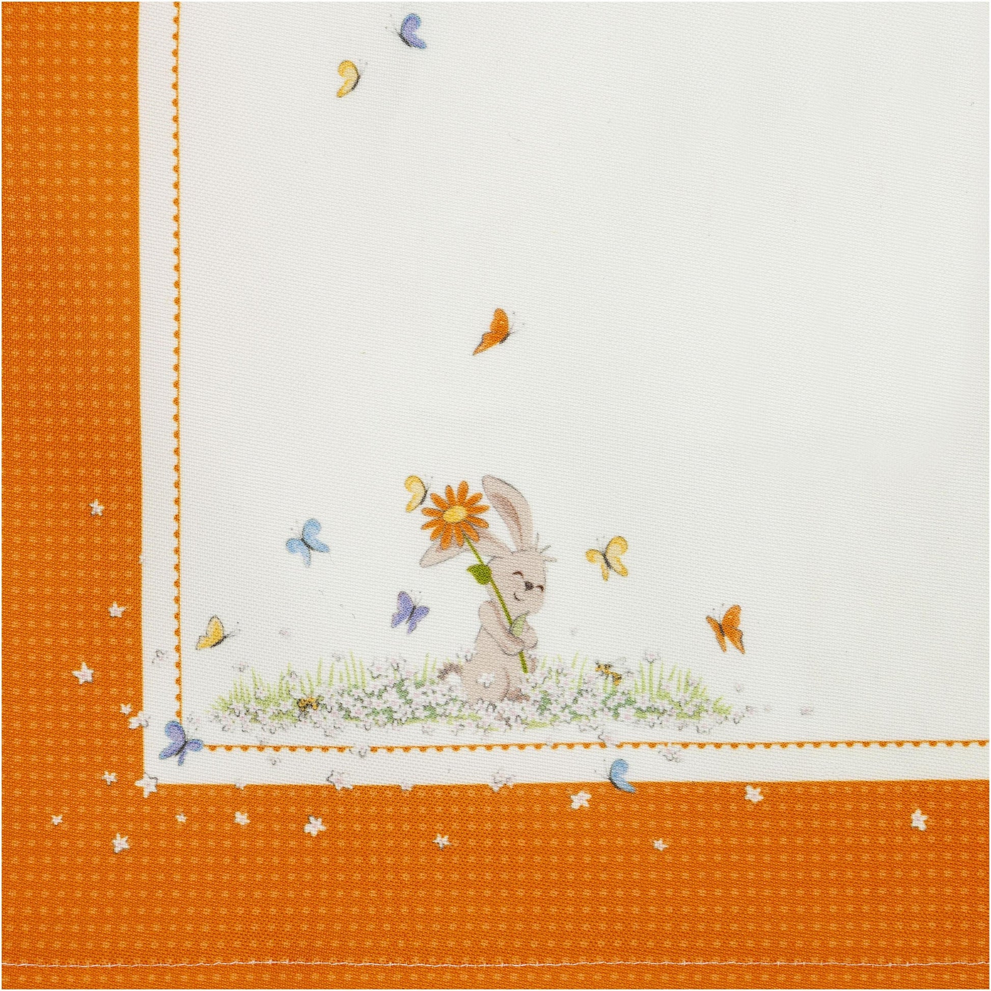 Auf jedem Platzdeckchen tummelt sich der süsse Hase Michel auf einer blühenden Frühlingswiese und verbreitet heitere Stimmung. Um ihn herum flattern Schmetterlinge, die aufgedruckte Randbordüre ist in kräftigem Orange gehalten und mit kleinen, feinen Pünktchen versehen.