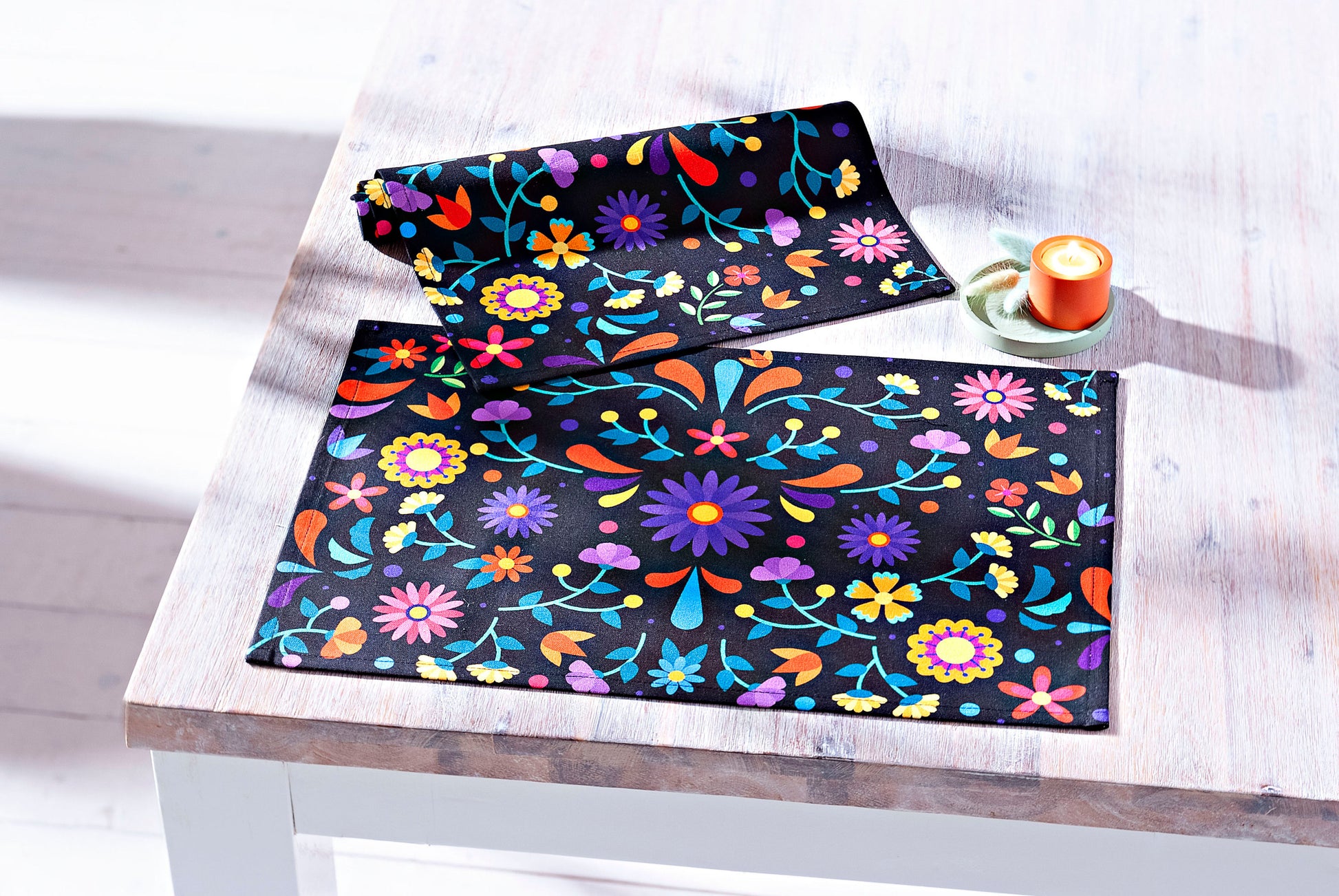 Bunte Blumen erblühen auf schwarzem Hintergrund und bringen Ihnen mexikanisches Flair nach Hause. Die farbenfrohen Tischsets "Mexiko" erinnern an die Gemälde der weltberühmten Malerin Frida Kahlo: Eine Prise Exotik, ein Hauch von Folklore, ein bisschen Hacienda-Style, gepaart mit einem intensiven Fest der Farben. Ob auf dem Esstisch oder als dekorative Unterlage für Vasen, Schalen oder Kerzenleuchter, auf diese Tischsets werden Sie garantiert mehr als einmal angesprochen werden, denn sie sind wirklich eine Augenweide.