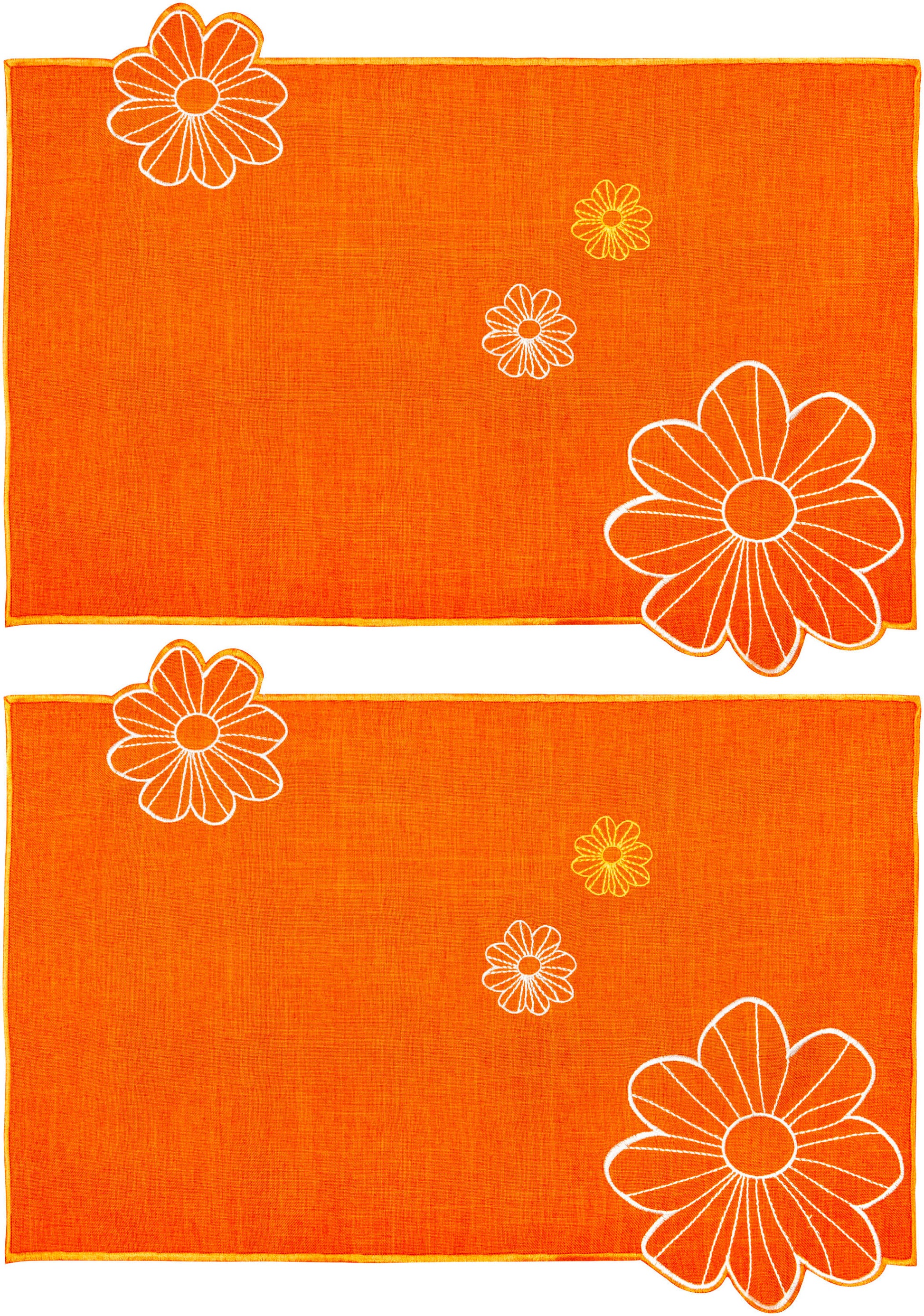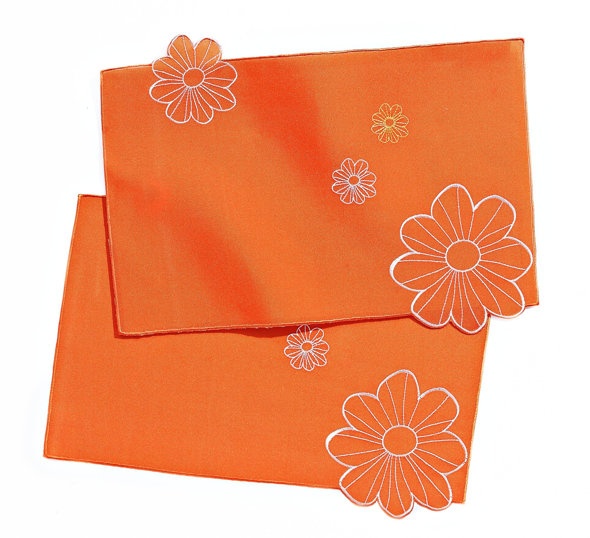 Ihr florales Design macht die beiden Tischsets zu etwas ganz Besonderem: hübsche Blütenmotive sind aufwendig aufgestickt, einige Blumen wachsen sogar dekorativ über den Rand hinaus. Dieser immerwährende Blumenschmuck ist im Handumdrehen aufgelegt und sorgt mit dem frischen Orangeton gleich für gute Laune.