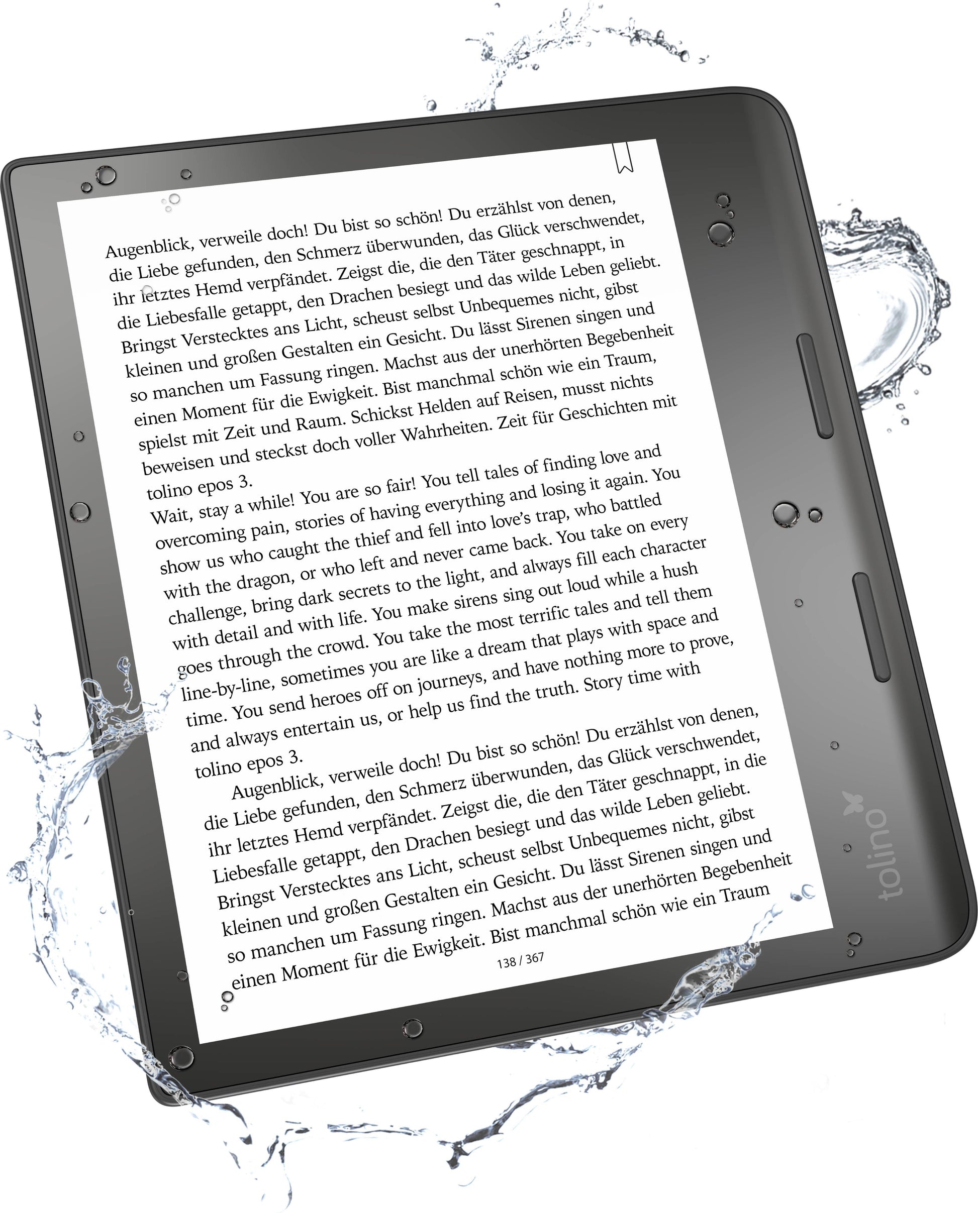 Mit dem tolino epos 3 erleben Sie das Maximum an Lesekomfort. Denn dank seines grossformatigen 8-Zoll-Displays passt noch mehr Text auf eine Seite, auch bei grossen Schriften. Dadurch müssen Sie weniger umblättern und bleiben länger im Lesefluss, wenn die Geschichte gerade einmal wieder richtig spannend ist. Entscheiden Sie, wie Sie am liebsten blättern: über das präzise Touchscreen oder die grossen Blättertasten am Rand Ihres Geräts.