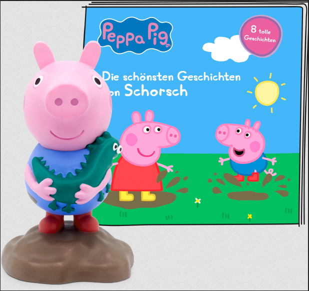 Sie ist klein, pink und liebt Matschepfützen über alles: Peppa Wutz begeistert mit ihren kurzen Geschichten schon die kleinsten Hörspielfans. Und jetzt kommt ihr kleiner Bruder Schorsch. Erlebt mit ihm und Peppa tolle Abenteuer: es geht zu Opi Mümmels Leuchtturm, zu Edmund Elefants Geburtstagsparty oder ins aufregende Mini-Land – stell Schorsch einfach auf deine Toniebox und begleite ihn und seine Familie und Freunde auf 8 lustigen Abenteuern.