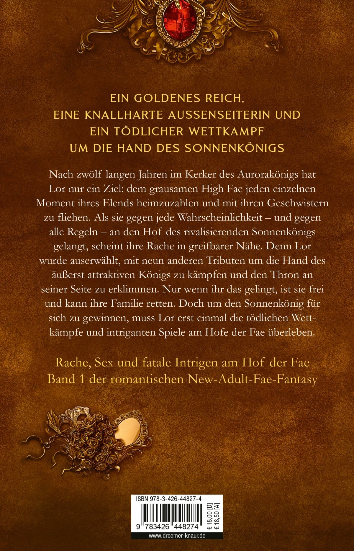 Ein goldenes Reich, eine knallharte Aussenseiterin und ein tödlicher Wettkampf um die Hand des Sonnenkönigs: Rache, Sex und fatale Intrigen am Hof der Fae!Nach zwölf langen Jahren im Kerker des Aurorakönigs hat Lor nur ein Ziel: dem grausamen High Fae jeden einzelnen Moment ihres Elends heimzuzahlen und mit ihren Geschwistern zu fliehen. Als sie gegen jede Wahrscheinlichkeit - und gegen alle Regeln - an den Hof des rivalisierenden Sonnenkönigs gelangt, scheint ihre Rache in greifbarer Nähe. Denn Lor wurde auserwählt mit neun anderen Tributen um die Hand des äusserst attraktiven Königs zu kämpfen und den Thron an seiner Seite zu erklimmen. Nur wenn ihr das gelingt, ist sie frei und kann ihre Familie retten. Doch um den Sonnenkönig für sich zu gewinnen, muss Lor erst einmal die tödlichen Wettkämpfe und intriganten Spiele am Hofe der Fae überleben.