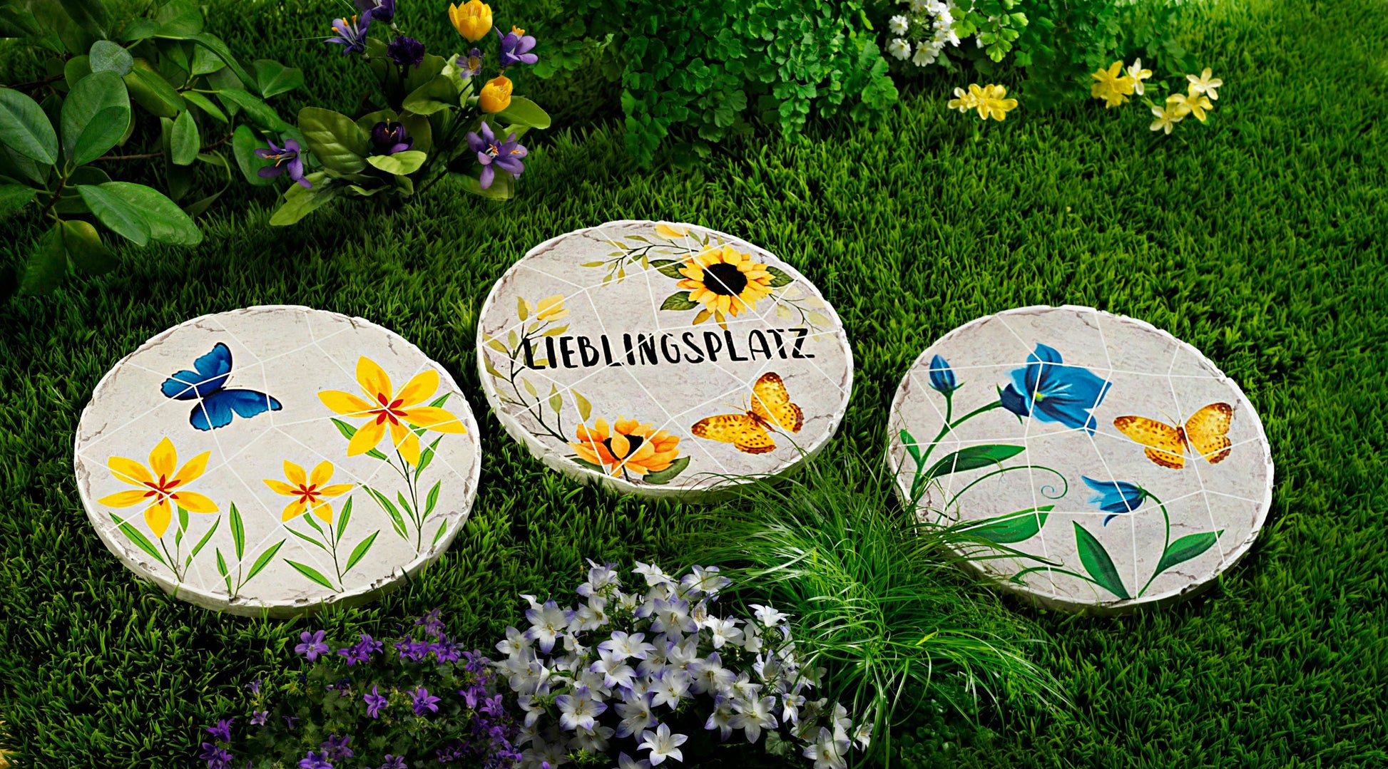 Trittsteine können auch richtig hübsch sein! Dieses Trio tritt den Beweis an. Jedes Stück ist im mit einem wunderschönen Blumen-Motiv gestaltet, auf dem Schmetterlinge tanzen. Eine Platte ziert sogar das Wort „Lieblingsplatz“ - haben Sie schon eine Idee, wo dieses Schmuckstück seinen Ehrenplatz bekommt!