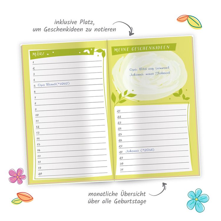 Dieser mit zauberhaften Blumenbildern und ausgewählten Spruchweisheiten gestaltete Taschenkalender bietet viel Platz für die Geburtstage von Familie, Freunden und Arbeitskollegen – und auch für Geschenkideen. Die Monatsübersichten sind jahresunabhängig, sodass der Kalender fortwährend verwendet werden kann. So vergessen Sie garantiert keine Geburtstage mehr!