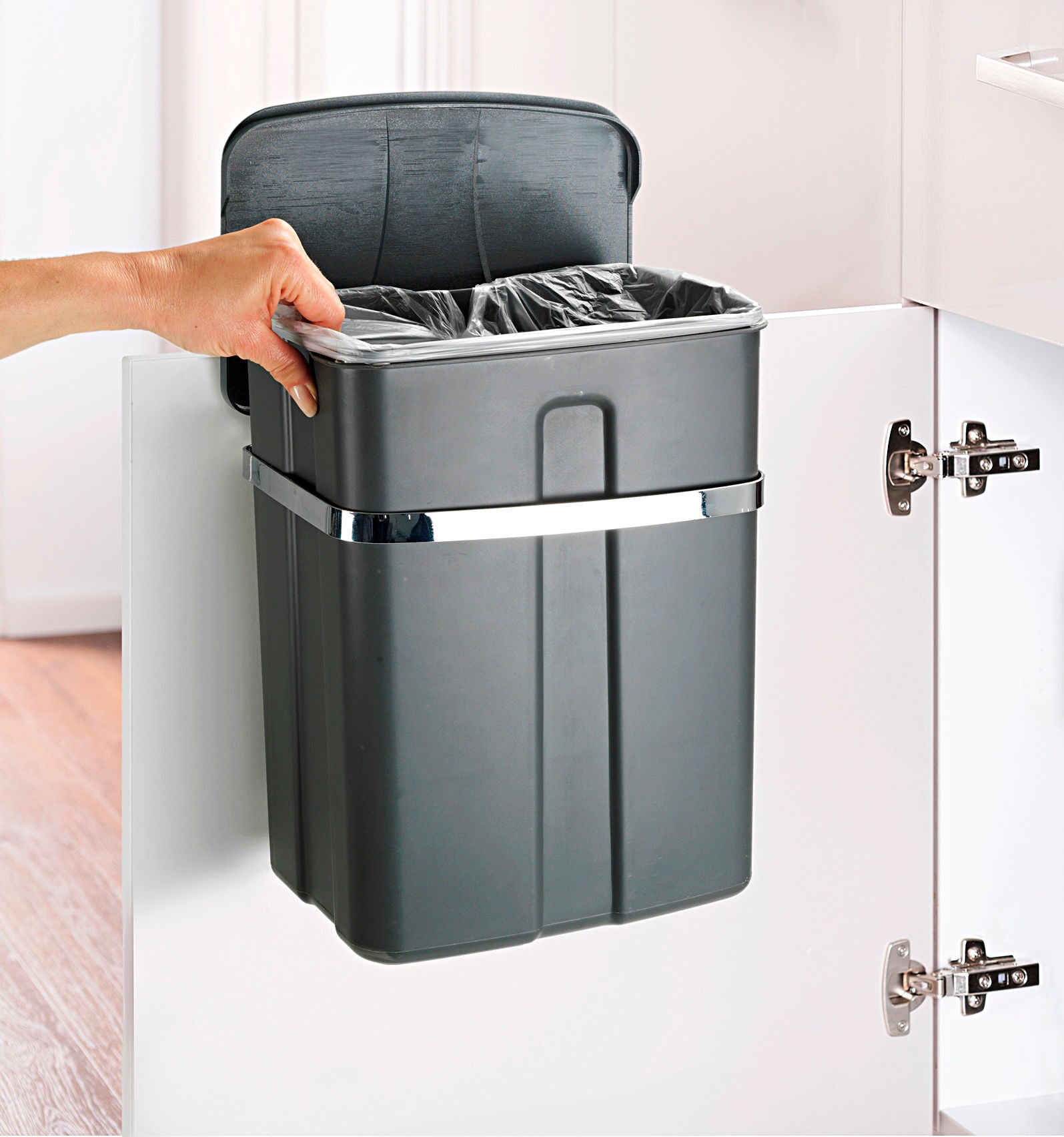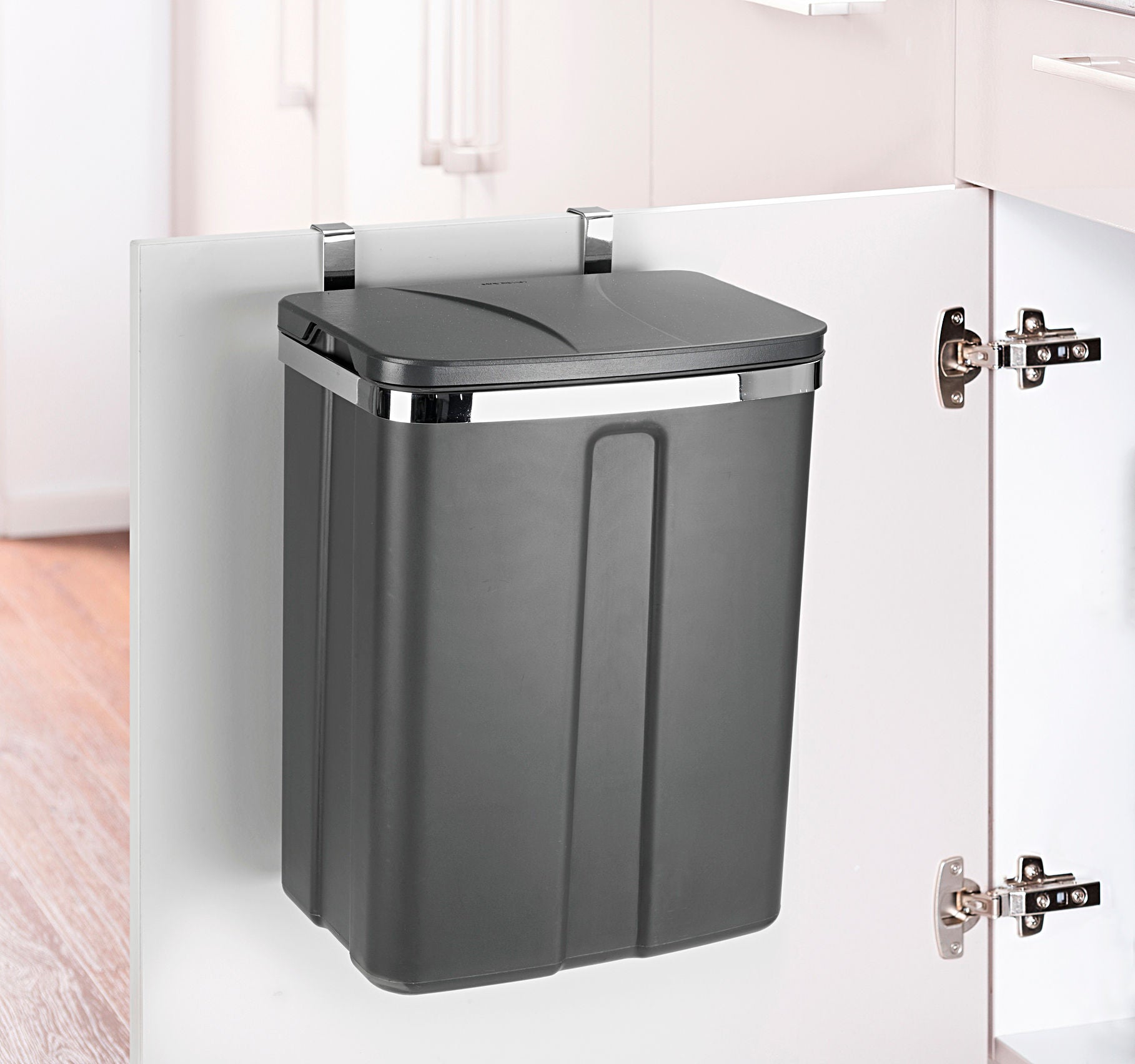 Der Tür-Abfalleimer lässt sich einfach in den Küchenschrank oder einer Schublade einhängen und ist so stets zur Stelle. Dank stabilem Stahlrahmen bleibt er fest und sicher in Position. Der Deckel hlt unliebsame Gerüche und Blicke zurück - ideal auch für den Bioabfall!