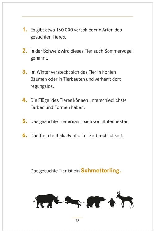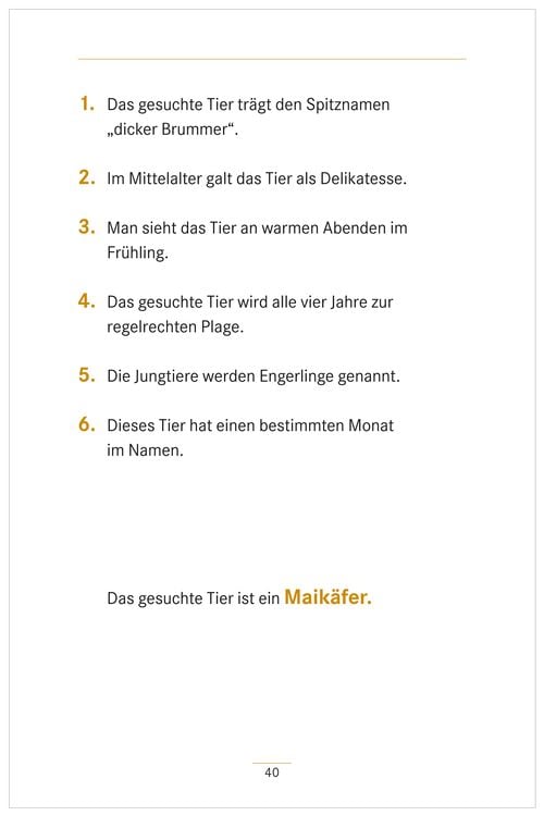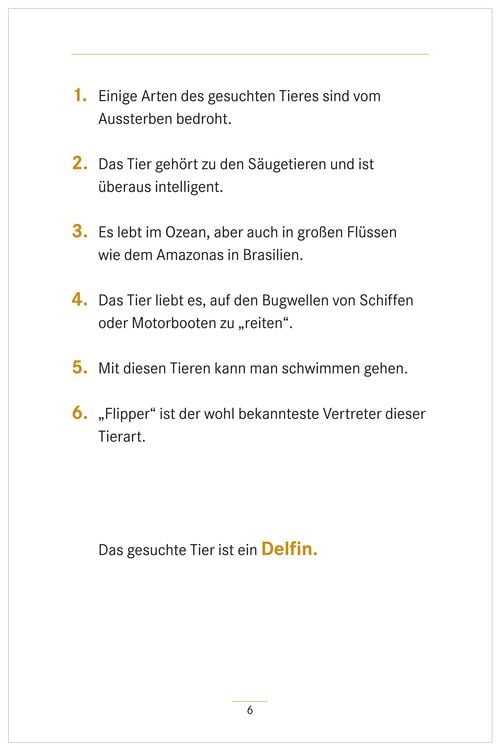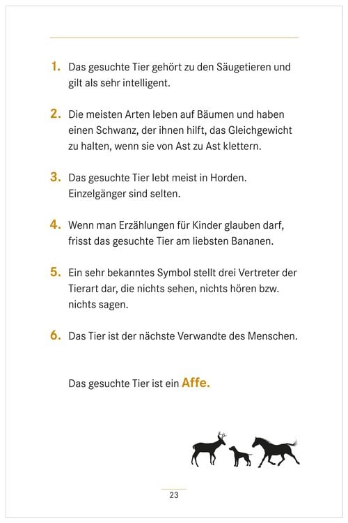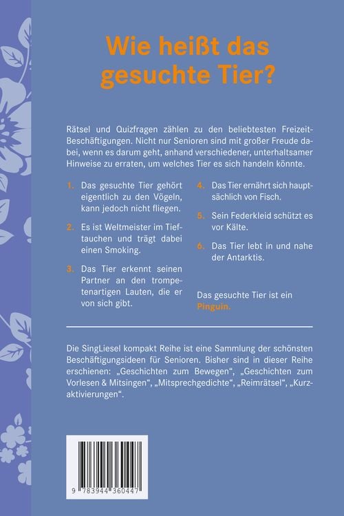 Wie heißt das gesuchte Tier? Rätselraten ist eine beliebte Beschäftigungsmöglichkeit für Senioren, ob zu Hause, in der Tagespflege oder der stationären Pflegeeinrichtung – und macht auch Ehepartnern, Kindern oder Betreuungskräften Spaß. Anhand immer konkreter werdender Hinweise können beliebte Tiere erraten werden. Erleben Sie mit diesem Rätselbuch unterhaltsame Ratestunden. - Das gesuchte Tier kann große Lasten tragen und ist auch in unwegsamen Gelände tritsicher - Meistens haben die Tiere graues Fell und einen dunklen Strich auf dem Rücken - Die Tiere sind sehr genügsam. Sie brauchen nur wenig Nahrung und fressen vor allem Heu und Gras. Natürlich freuen sie sich auch über eine Karotte, einen Apfel oder altes Brot - Oft heißt es, dass das gesuchte Tier stur und dumm sei. Das stimmt aber gar nicht. Es ist ein sehr schlaues Tier, das sich nur nicht alles gefallen lässt. - Die Tiere sehen aus wie kleine Pferde mit zu großen Ohren Das gesuchte Tier ist ein ... ?