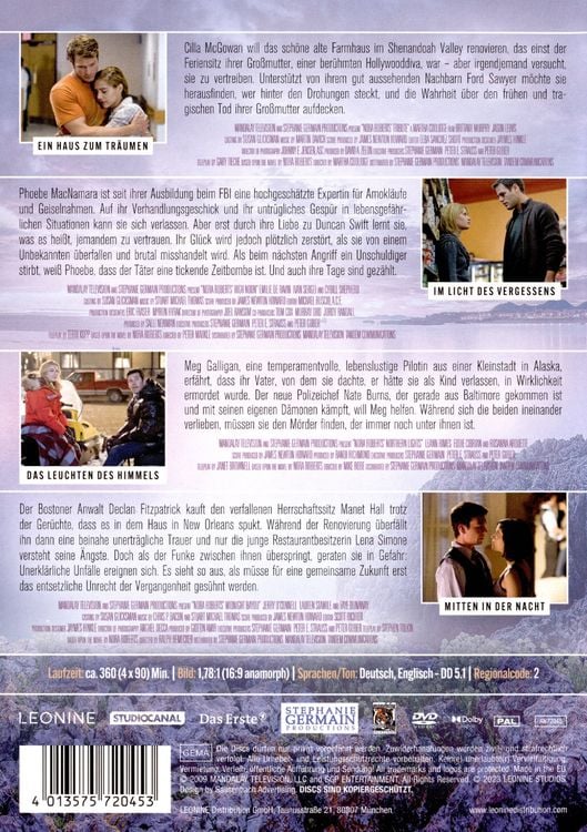 "Ein Haus zum Träumen": Cilla McGowan will das schöne alte Farmhaus im Shenandoah Valley renovieren, das einst der Feriensitz von ihrer Großmutter, einer berühmten Hollywood-Diva, war, aber irgendjemand versucht, sie zu vertreiben. Unterstützt von ihrem gutaussehenden Nachbarn Ford Sawyer will sie herausfinden, wer hinter den Drohungen steckt und die Wahrheit über den frühen und tragischen Tod ihrer Großmutter aufdecken. "Im Licht des Vergessens": Phoebe MacNamara ist seit ihrer Ausbildung beim FBI eine hoch geschätzte Expertin bei Amokläufen und Geiselnahmen. Auf ihr Verhandlungsgeschick und ihr untrügliches Gespür in lebensgefährlichen Situationen kann sie sich verlassen. Aber erst durch ihre Liebe zu Duncan Swift lernt sie, was es heißt, jemandem zu vertrauen. Doch ihr Glück wird plötzlich zerstört, als sie von einem Unbekannten überfallen und brutal misshandelt wird. Als beim nächsten Angriff ein Unschuldiger stirbt, weiß Phoebe, dass der Täter eine tickende Zeitbombe ist. Und auch ihre Tage sind gezählt. "Das Leuchten des Himmels": Meg Galligan, eine temperamentvolle, lebenslustige Pilotin in einer Kleinstadt in Alaska, erfährt, dass ihr Vater, von dem sie dachte, er hätte sie als Kind verlassen, in Wirklichkeit ermordet wurde. Der neue Polizeichef Nate Burns, der gerade aus Baltimore gekommen ist und mit seinen eigenen Dämonen kämpft, will Meg helfen. Während sie sich ineinander verlieben, müssen sie den Mörder finden, der immer noch unter ihnen ist. "Mitten in der Nacht": Der Bostoner Anwalt Declan Fitzpatrick kauft den verfallenen Herrschaftssitz Manet Hall trotz der Gerüchte, dass es in dem Haus in New Orleans spukt. Während der Renovierung überfällt ihn dann eine beinahe unerträgliche Trauer und nur die junge Restaurantbesitzerin Lena Simone versteht seine Ängste. Aber als der Funke zwischen ihnen überspringt, geraten sie in Gefahr: Unerklärliche Unfälle ereignen sich. Es sieht so aus, als müsse für eine gemeinsame Zukunft erst das entsetzliche Unrecht der Vergangenheit gesühnt werden.