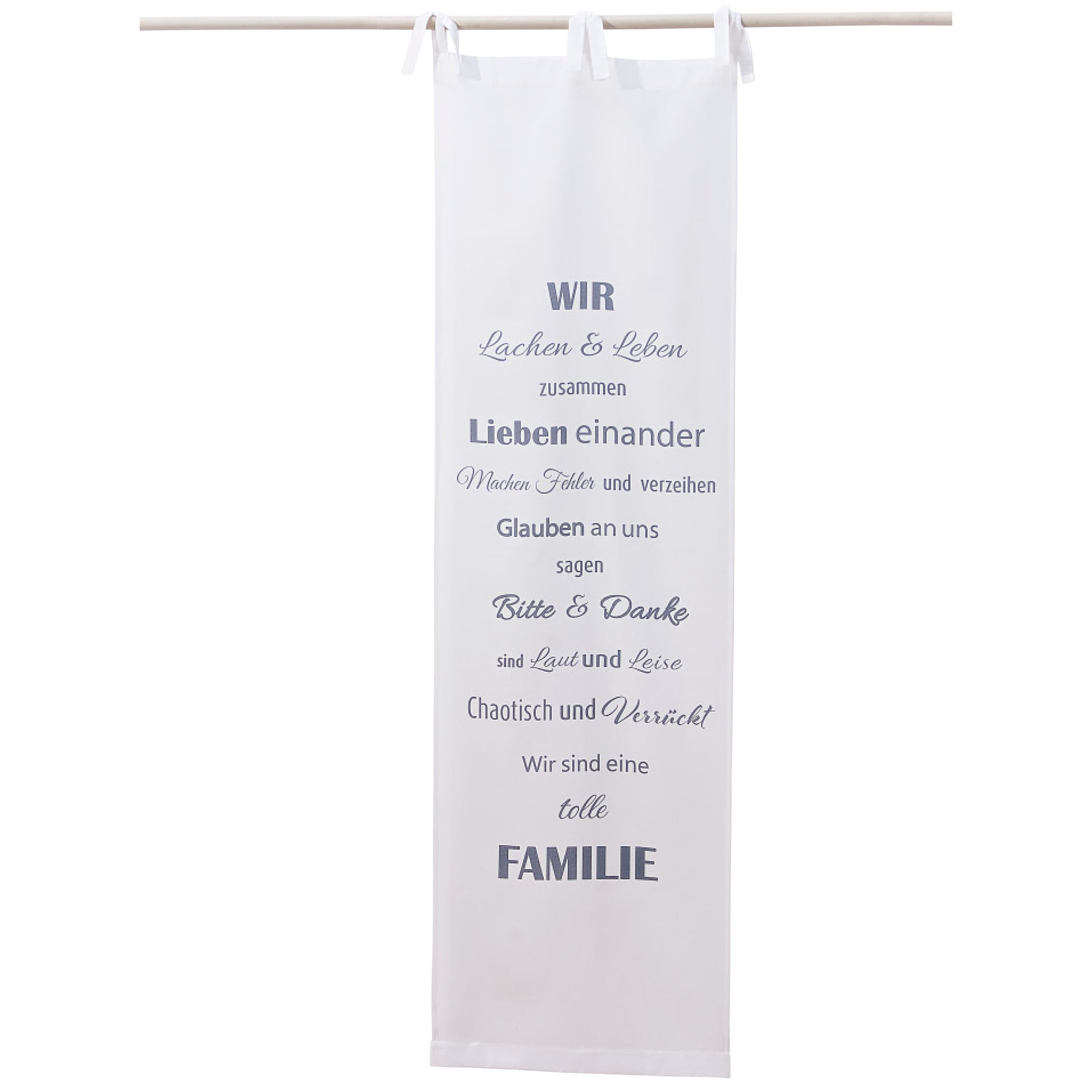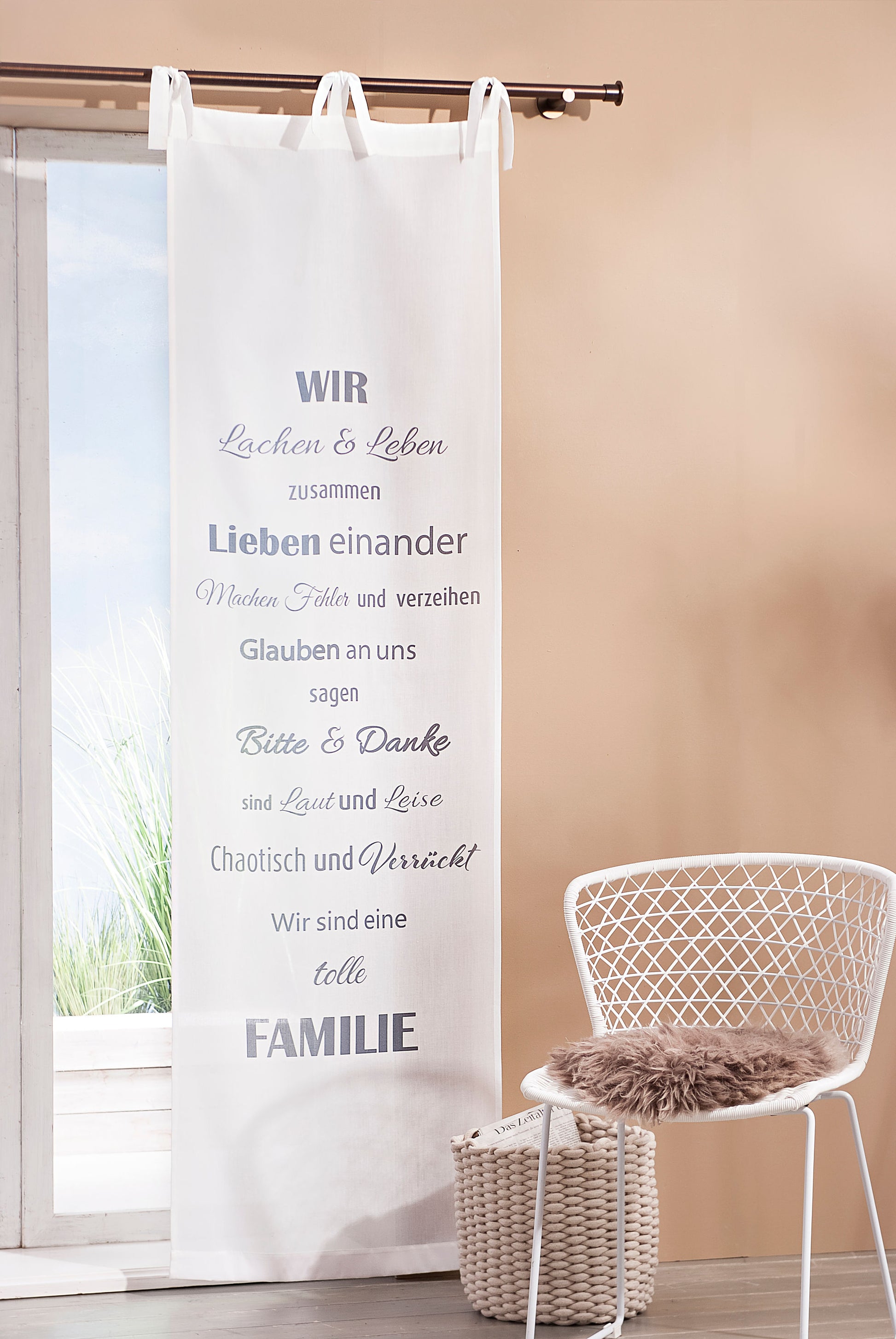Ein trendiger Blickfang für Ihr Zuhause, ob als klassische Gardine oder als schicker Wandbehang. Tipp: Der Vorhang &bdquoFamilie&ldquo wirkt auch toll als Raumteiler oder als Schranktür-Alternative am Vorrats- oder Schuhregal. Mit den Bindebändern ist er schnell aufgehängt, z.B. an einer Gardinenstange oder an einem Ast.
