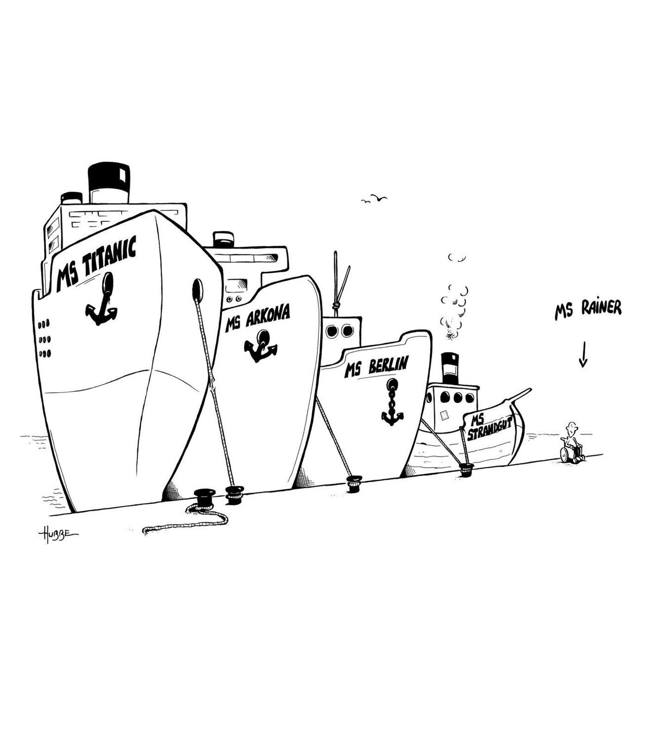 Wir feiern 20 Jahre Behinderte Cartoons von Phil Hubbe!Phil Hubbe, selbst an Multipler Sklerose (MS) erkrankt, zeichnet seit über 20 Jahren Cartoons über das Leben mit Behinderungen. Er thematisiert den oft schwierigen Alltag und die absurden Situationen, die Betroffene meistern müssen. Wo man verzweifeln könnte, schafft er mit viel Humor Raum für befreiendes Lachen und neuen Mut. Phil Hubbe ist selbst sehr aktiv und macht auch international Ausstellungen und Lesungen. Seine Werke sorgen für viel positive Resonanz bei Betroffenen und Angehörigen.