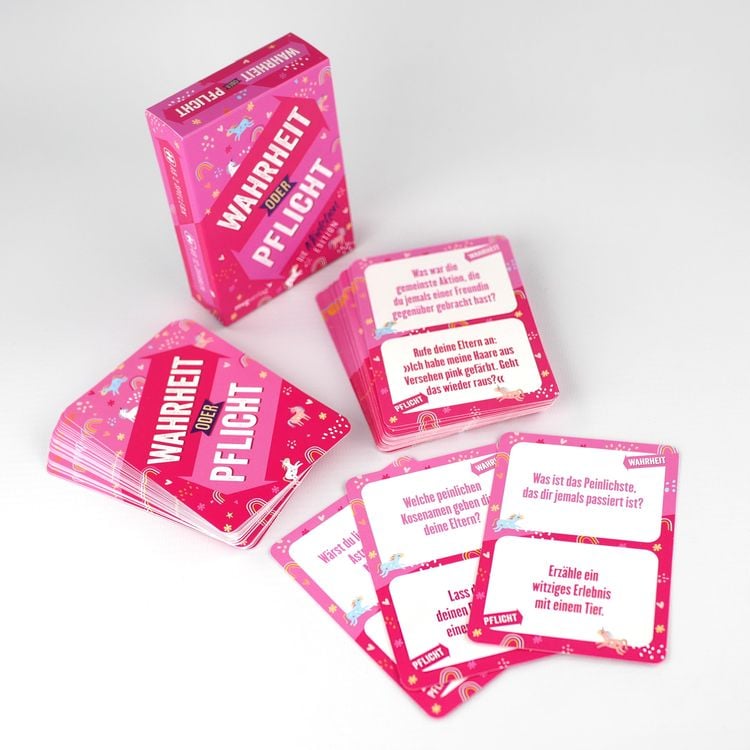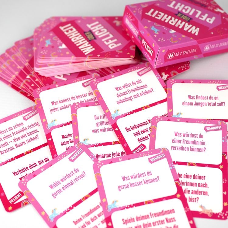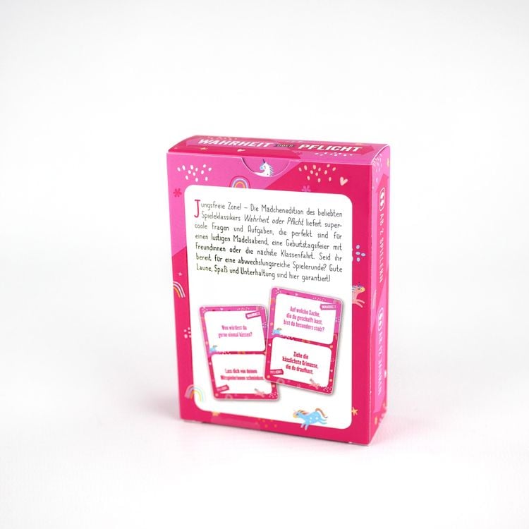 Jungsfreie Zone! - Die Mädchenedition des beliebten Spieleklassikers Wahrheit oder Pflicht liefert supercoole Fragen und Aufgaben, die perfekt sind für einen lustigen Mädelsabend, eine Geburtstagsfeier mit Freundinnen oder die nächste Klassenfahrt. Seid ihr bereit für eine abwechslungsreiche Spielerunde? Gute Laune, Spaß und Unterhaltung sind hier garantiert!