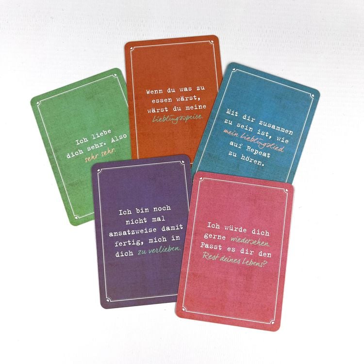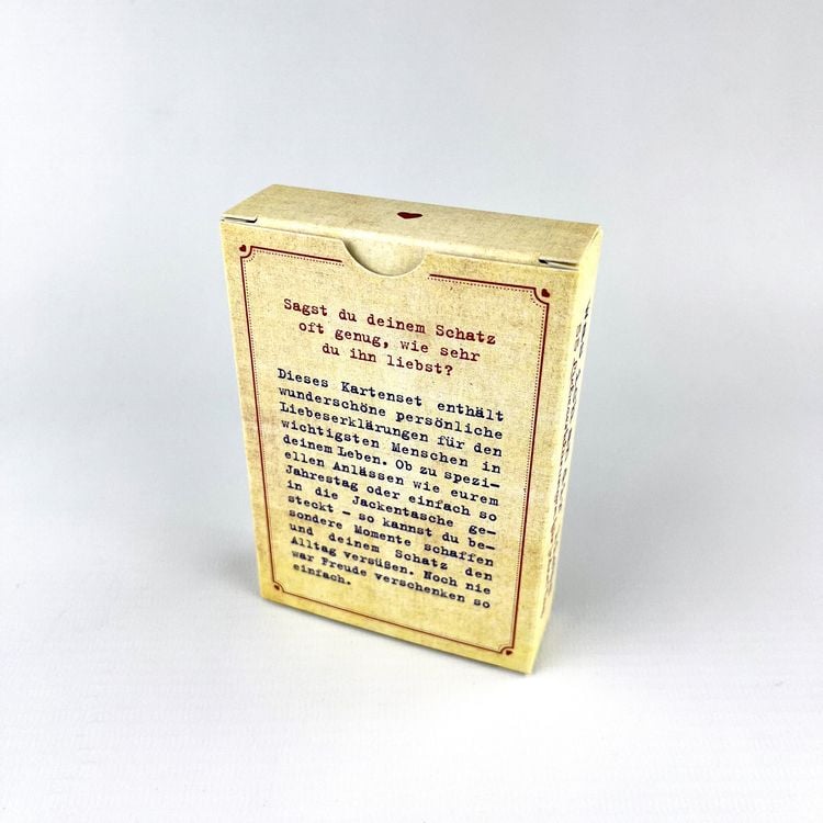 Sagst du deinem Schatz oft genug, wie sehr du ihn liebst? Dieses Kartenset enthält wunderschöne persönliche Liebeserklärungen für den wichtigsten Menschen in deinem Leben. Ob zu speziellen Anlässen wie eurem Jahrestag oder einfach so in die Jackentasche gesteckt – so kannst du besondere Momente schaffen und deinem Schatz den Alltag versüßen. Noch nie war Freude verschenken so einfach.