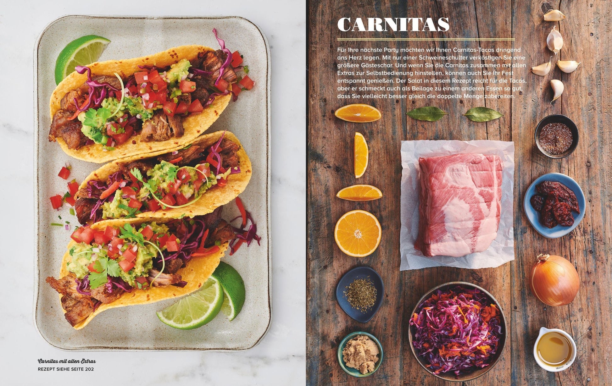 - Inhalt: "Die 4 T", "Vorspeisen", "Rind &Lamm", "Schwein", "Geflügel", "Seafood", "Gemüse & Beilagen", "Desserts", "Extras"