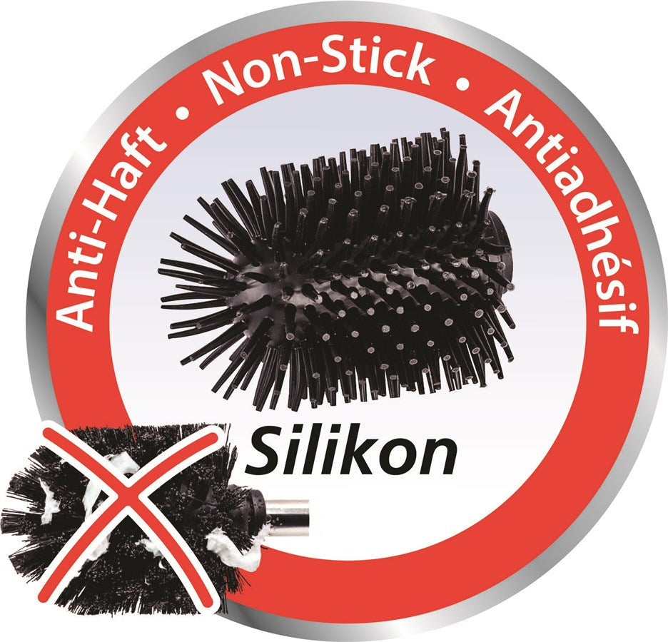 Die im Lieferumfang enthaltene WC-Bürste ist mit einem schwarzen, auswechselbaren Bürstenkopf von Ø 7,5 cm versehen. Der hochwertige Bürstenkopf ist aus Silikon gefertigt. Seine spezielle Anti-Haft-Wirkung sorgt dafür, dass sich hartnäckige Reste und Toilettenpapier nicht in der Bürste festsetzen, sondern beim Reinigen einfach weggespült werden. So bleibt die clevere Bürste immer hygienisch sauber und reinigt sich selber.