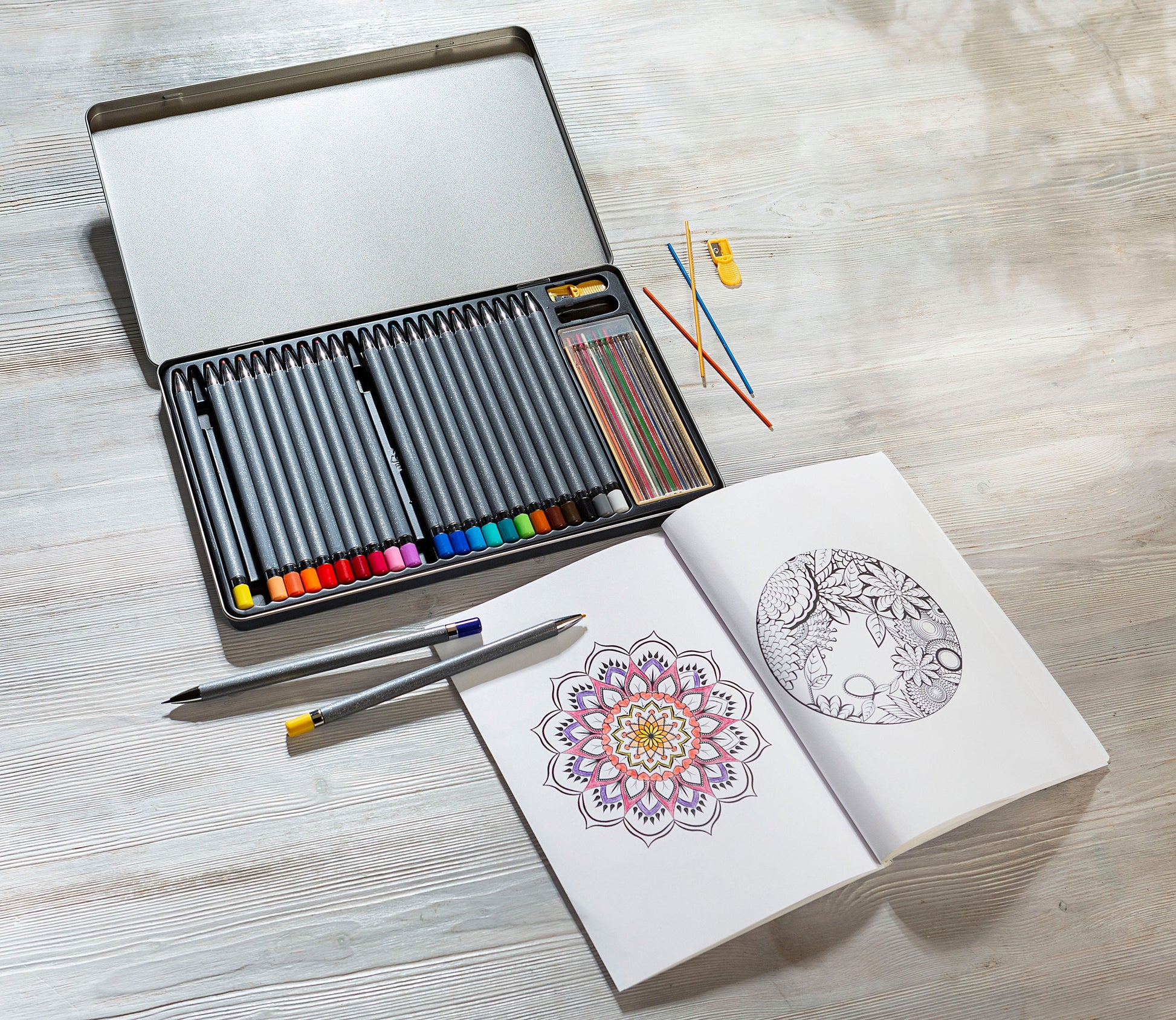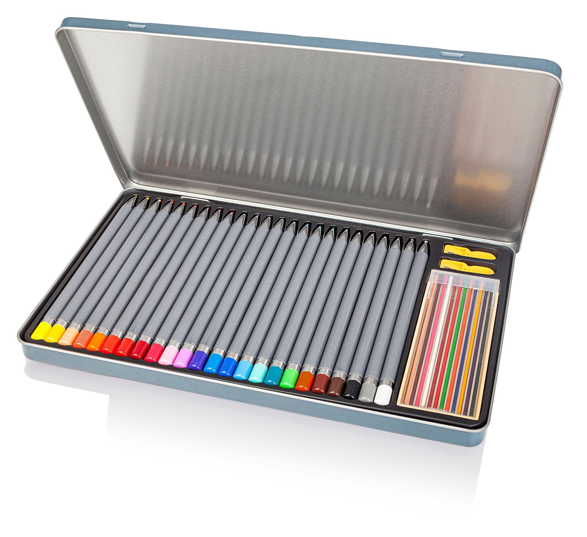 Mit diesen Buntstiften macht (Aus)Malen und Zeichnen noch mehr Spaß: Sie kommen in einem hochwertigen, dekorativ gestalteten Metall-Etui. Die Stifte selbst sind auch schön gestaltet - in Grau-Glitzer mit bunten Stiftenden in der jeweiligen Minenfarbe. Das Besondere ist jedoch, dass sich bei diesen Stiften die Minen wieder auffüllen lassen - für noch längeres Malvergnügen und mehr Nachhaltigkeit. 24 Ersatzminen sind bereits enthalten.
