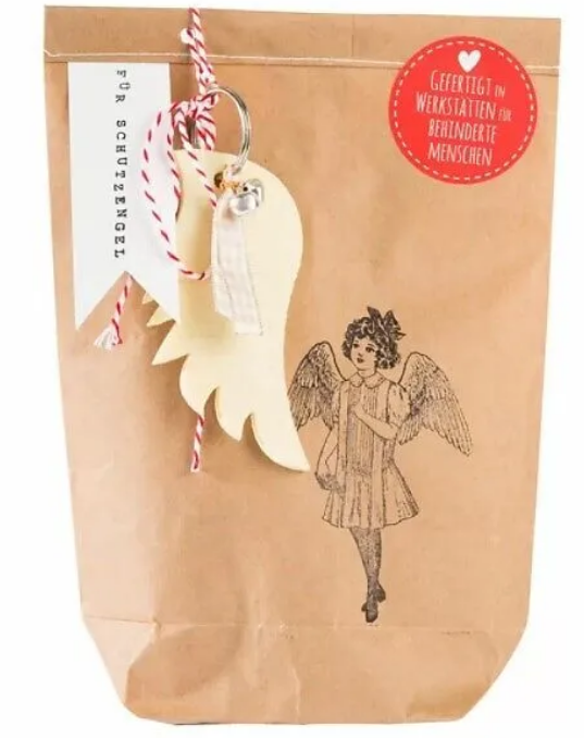 Inhalt: Flügel Schlüsselanhänger, Pergamin Teelichtbanderole für stimmungsvolles Licht, Teelicht, Holz Schutzengelchen als Begleiter, Engelgedicht