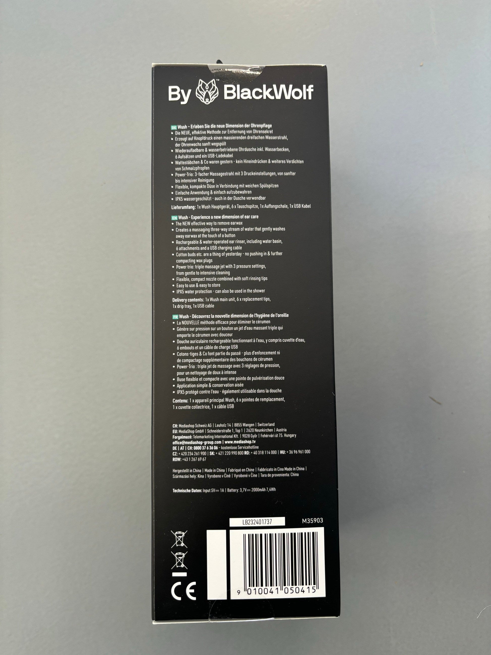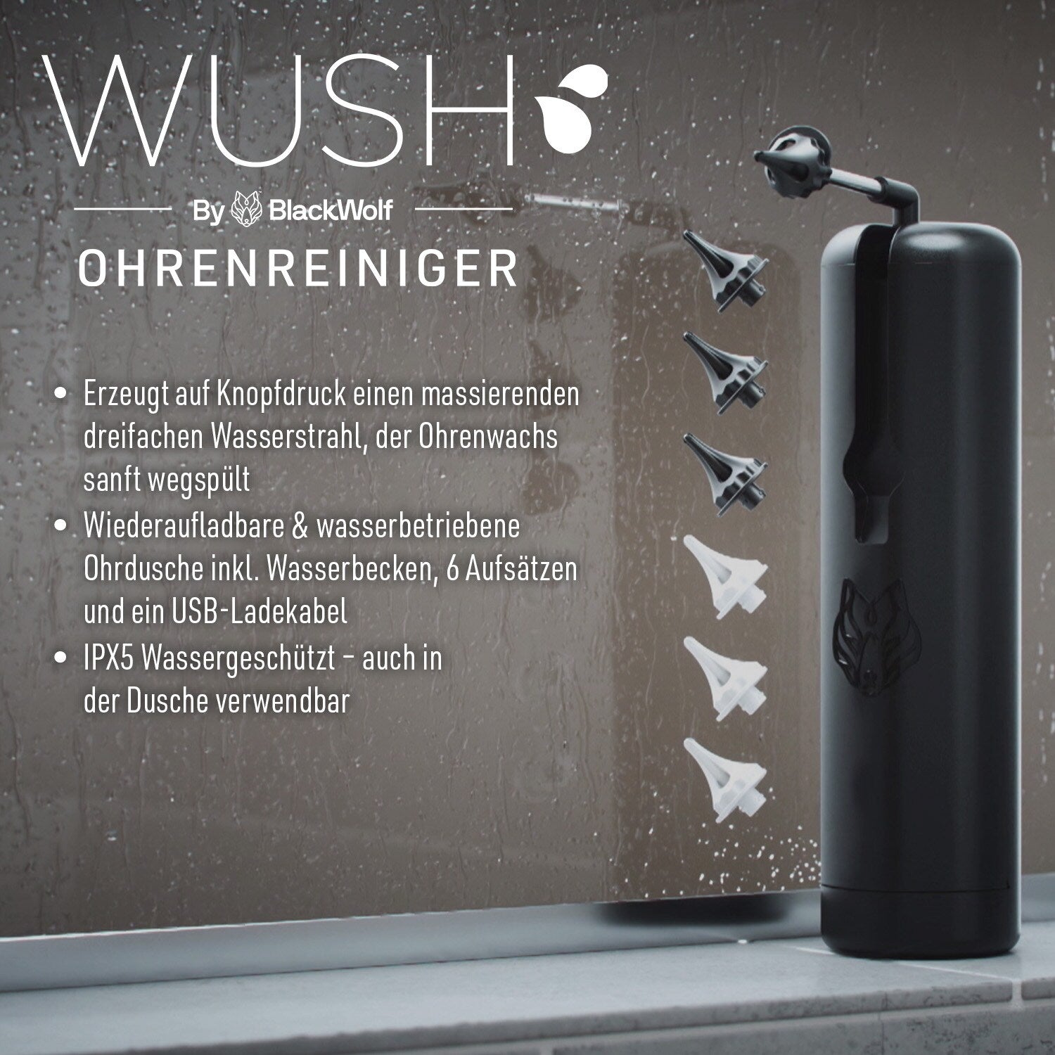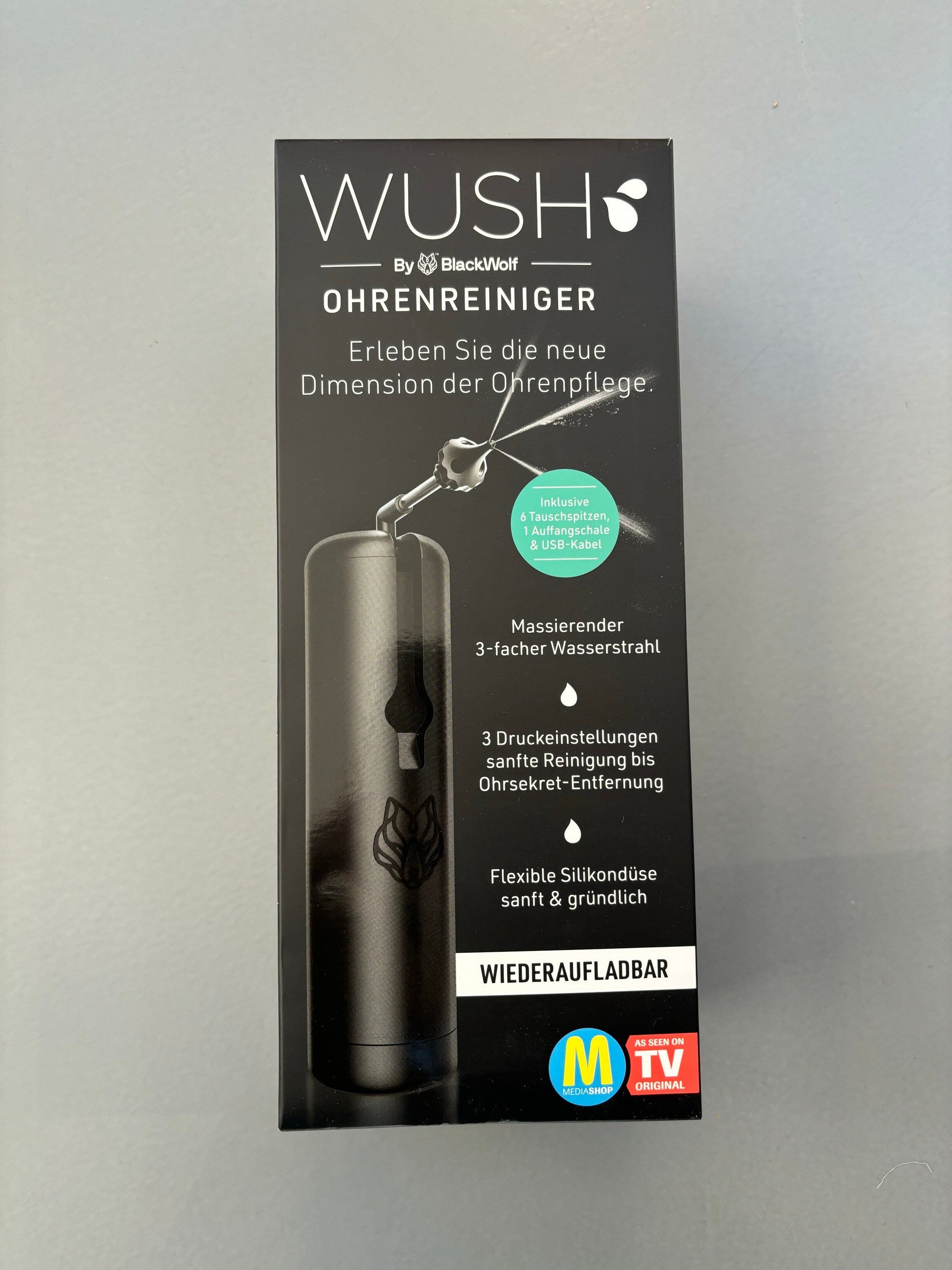 Erleben Sie eine sichere und effektive Methode zur Ohrenpflege mit dem Wush Ohrenreiniger.Dreifacher massierender WasserstrahlWiederaufladbar und wasserbetriebenEnthält Wasserbecken, 6 Aufsätze und ein USB-LadekabelKein Hineindrücken oder Verdichten von Schmalzpfropfen3-facher Massagestrahl mit DruckeinstellungenFlexible, kompakte Düse für einfache Anwendung und AufbewahrungDer Wush Ohrenreiniger bietet eine innovative Methode zur sicheren Entfernung von Ohrenschmalz. Mit nur einem Knopfdruck erzeugt er einen massierenden dreifachen Wasserstrahl, der das Ohrenwachs sanft wegspült. Im Lieferumfang enthalten sind sechs verschiedene Aufsätze, ein Wasserbecken und ein praktisches USB-Ladekabel für die wiederaufladbare Funktion.Im Gegensatz zu herkömmlichen Methoden wie Wattestäbchen vermeidet der Wush Ohrenreiniger das Hineindrücken und Verdichten von Schmalzpfropfen, was zu einer sichereren und effektiveren Ohrenpflege führt. Das Power-Trio bietet drei Druckeinstellungen für verschiedene Bedürfnisse von sanfter Reinigung bis hin zur Ohrsekret-Entfernung.Die flexible und kompakte Düse in Verbindung mit den weichen Spülspitzen passt perfekt in jedes Ohr. Dank seiner Wasserfestigkeit ist der Ohrenreiniger sicher und praktisch, sogar in der Dusche anwendbar. Geniessen Sie eine mühelose und effiziente Ohrenpflege mit dem Wush Ohrenreiniger für ein erfrischendes Gefühl und saubere Ohren.