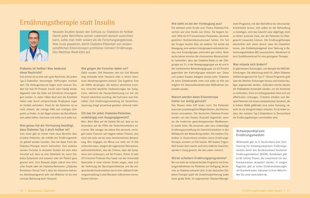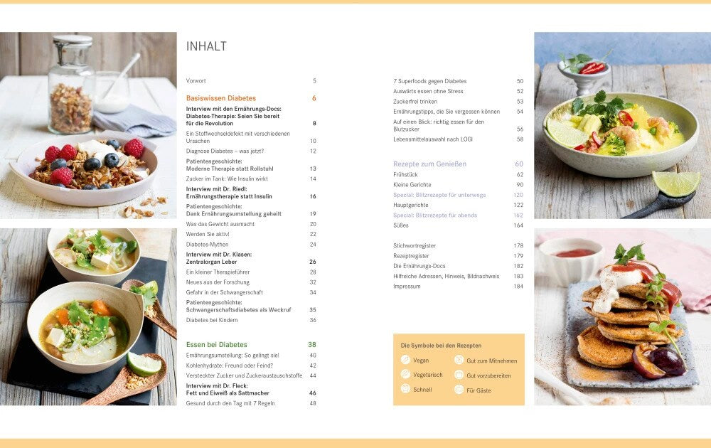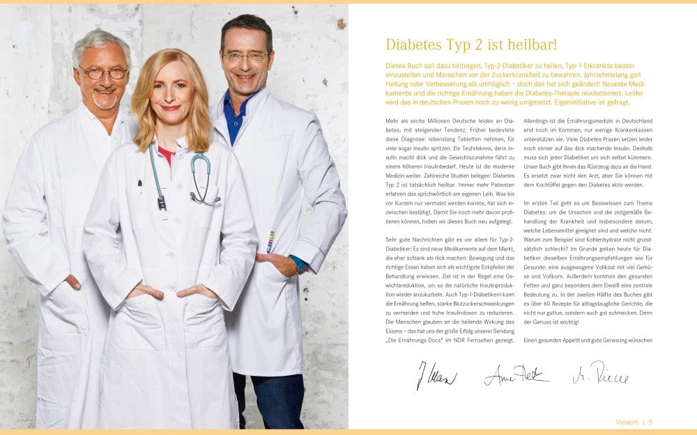 Bei 90 Prozent aller Diabetiker ist der Lebensstil die Ursache der Erkrankung. Die gute Nachricht: Die Kombination aus gesunder Ernährung und ausreichender Bewegung mit neuen Medikamenten, die nicht mehr dick machen, hat die Diabetes-Therapie revolutioniert. Was bis vor Kurzem nur vermutet wurde, hat sich inzwischen bestätigt. Zahlreiche Studien belegen: Diabetes Typ 2 ist tatsächlich heilbar - und die Ernährungsmedizin ist die wichtigste Säule der Behandlung. Damit die Betroffenen noch mehr davon profitieren können, haben die Ernährungs-Docs ihr Standardwerk jetzt überarbeitet und neu aufgelegt: mit neuen Fakten und auf dem aktuellen Stand der Forschung. Wie schaffe ich es als Typ-2-Diabetiker, der Insulinfalle zu entkommen? Und wie kann ich - auch bei Diabetes Typ 1 - meine Blutzuckerwerte nachhaltig verbessern? Welche Lebensmittel sind besonders geeignet - und sind Kohlenhydrate grundsätzlich schlecht? Diese Fragen und alles Wissenswerte zum Thema Diabetes und gesunde Ernährung erläutern die Top-Mediziner Dr. med. Matthias Riedl, Dr. med. Anne Fleck und Dr. med. Jörn Klasen umfassend und leicht verständlich. Sie vermitteln Ihnen das nötige Know-how, damit Sie Ihre Lebensqualität deutlich verbessern und die Krankheit in den Griff bekommen können. Der große Rezeptteil mit mehr als 60 Rezepten macht die Umsetzung in der heimischen Küche ganz einfach. Und in dem beigelegten Ernährungs- und Bewegungstagebuch kann jeder das eigene Verhalten analysieren und die Fortschritte festhalten. Bieten Sie Diabetes die Stirn - mit Messer und Gabel statt mit Insulin und Co.!